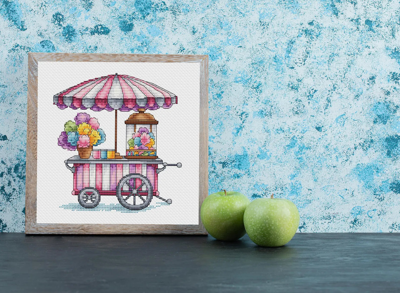 This colorful cotton candy cart cross stitch design brings the joy and nostalgia of childhood. Perfect for a kid’s room or as a vibrant home décor element. The embroidery captures a festive mood and sweet memories with its playful and cheerful look.