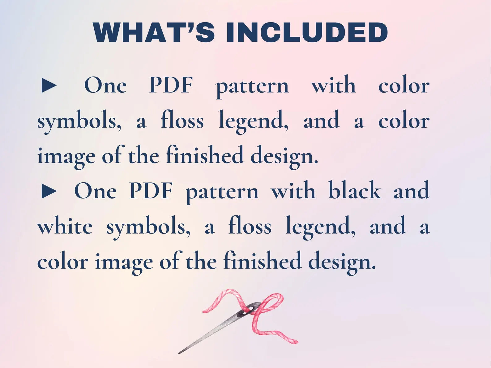 ✔ 1 PDF pattern with color symbols and a floss legend, plus a color image of the finished design.