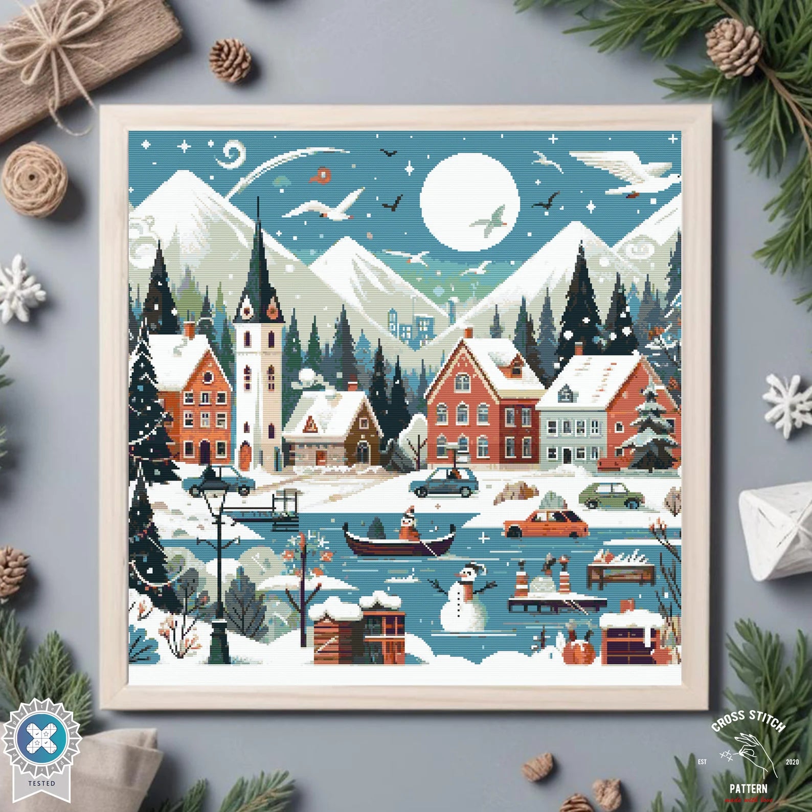 This cross-stitch pattern presents a quaint village scene under a starry winter night. The composition includes a large, well-decorated Christmas tree in the foreground, surrounded by charming houses with snowy roofs. Various Christmas decorations like wreaths and festive lights adorn the buildings, enhancing the holiday spirit. Snow blankets the landscape, streets, and trees, emphasizing a cold yet cozy winter atmosphere. The serene setting is further highlighted by soft snowflakes that add a sense of calm and quiet to the bustling village scene.
