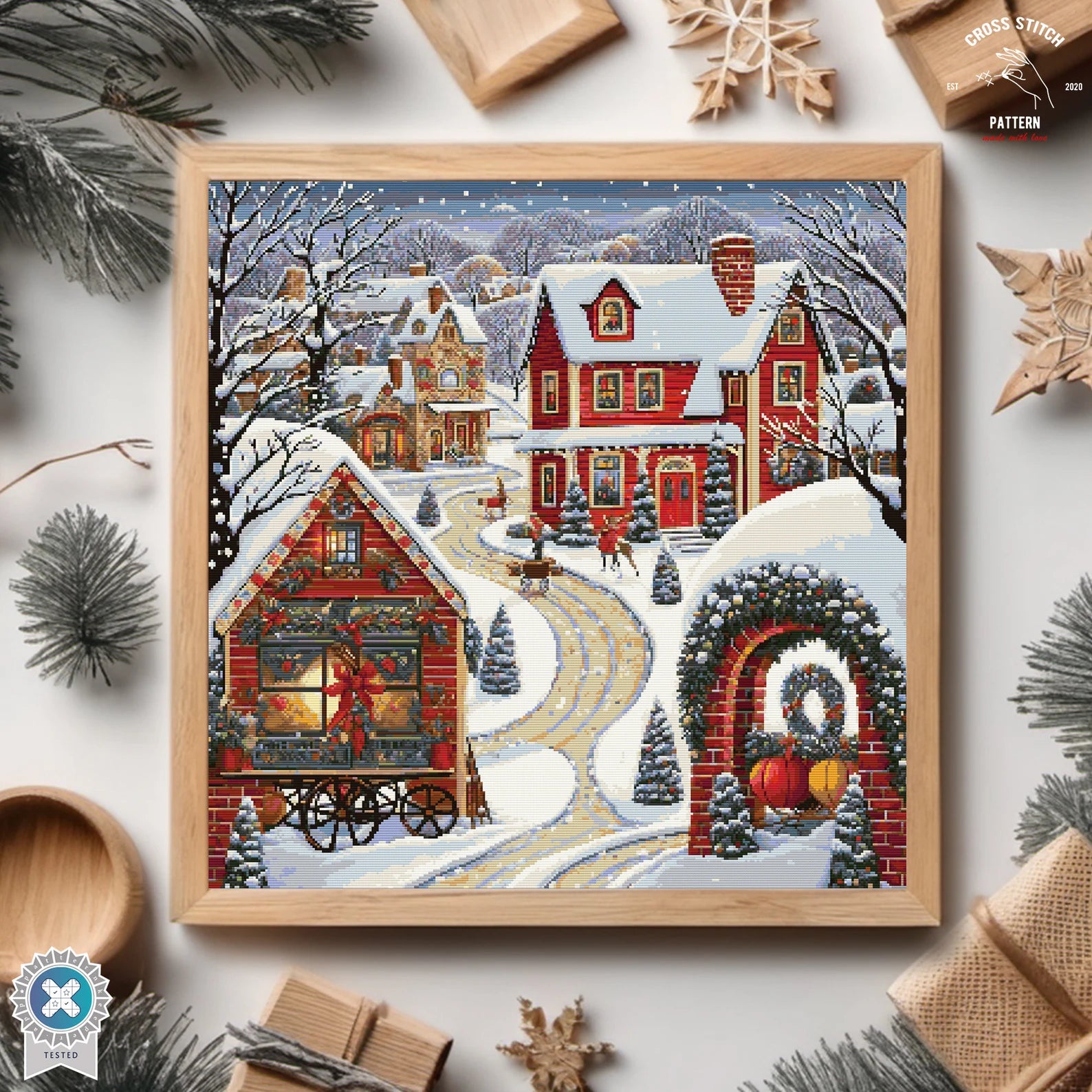 This cross-stitch pattern features a winter village scene glowing with festive charm. It portrays a collection of cozy, warmly lit homes nestled among snow-covered trees, each building uniquely adorned with seasonal decorations. The central house, painted in vibrant red, stands out with its inviting porch. A winding road dusted with snow meanders through the village, enhancing the quaint and peaceful atmosphere. Snowflakes gently fall in the background, adding to the serene winter wonderland ambiance. This pattern captures the essence of a picturesque holiday season in a small town, perfect for creating a heartwarming piece of art during the festive months.