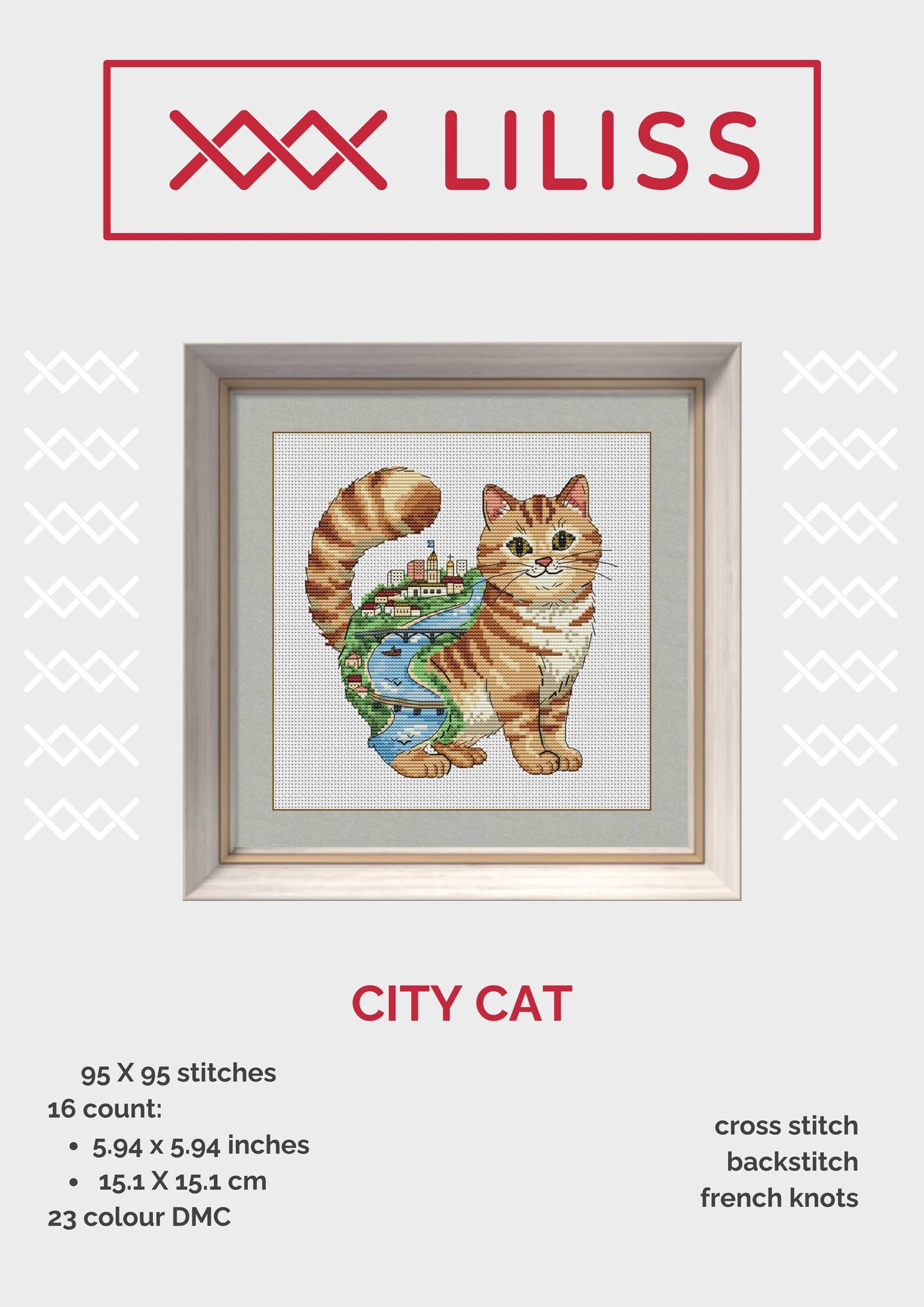This unique cross stitch design blends the charm of a curious cat with the magic of a bustling cityscape. On the cat's back, you'll discover detailed buildings, bridges, and a flowing river – a little urban dream stitched into a feline form.
