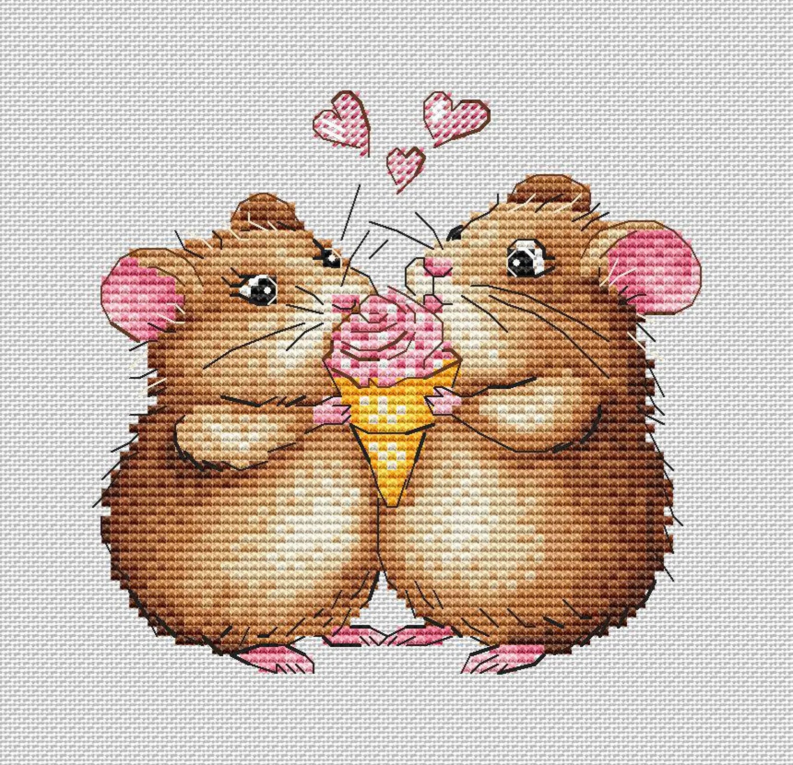 Add a touch of sweetness to your stitching with this adorable cross stitch pattern featuring two fluffy hamsters sharing a rose-shaped ice cream! Perfect for animal lovers and fans of kawaii or romantic designs, this easy and quick project is ideal for beginners or anyone looking for a fun weekend stitch.