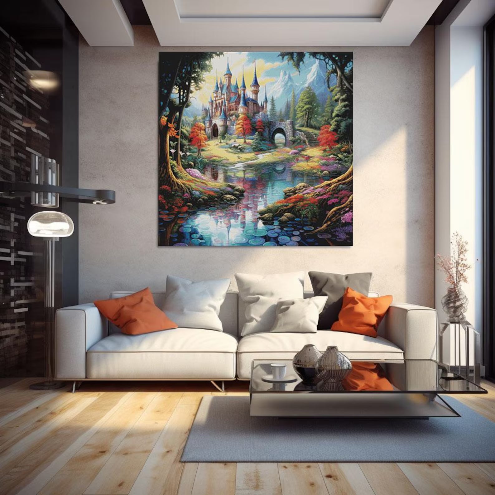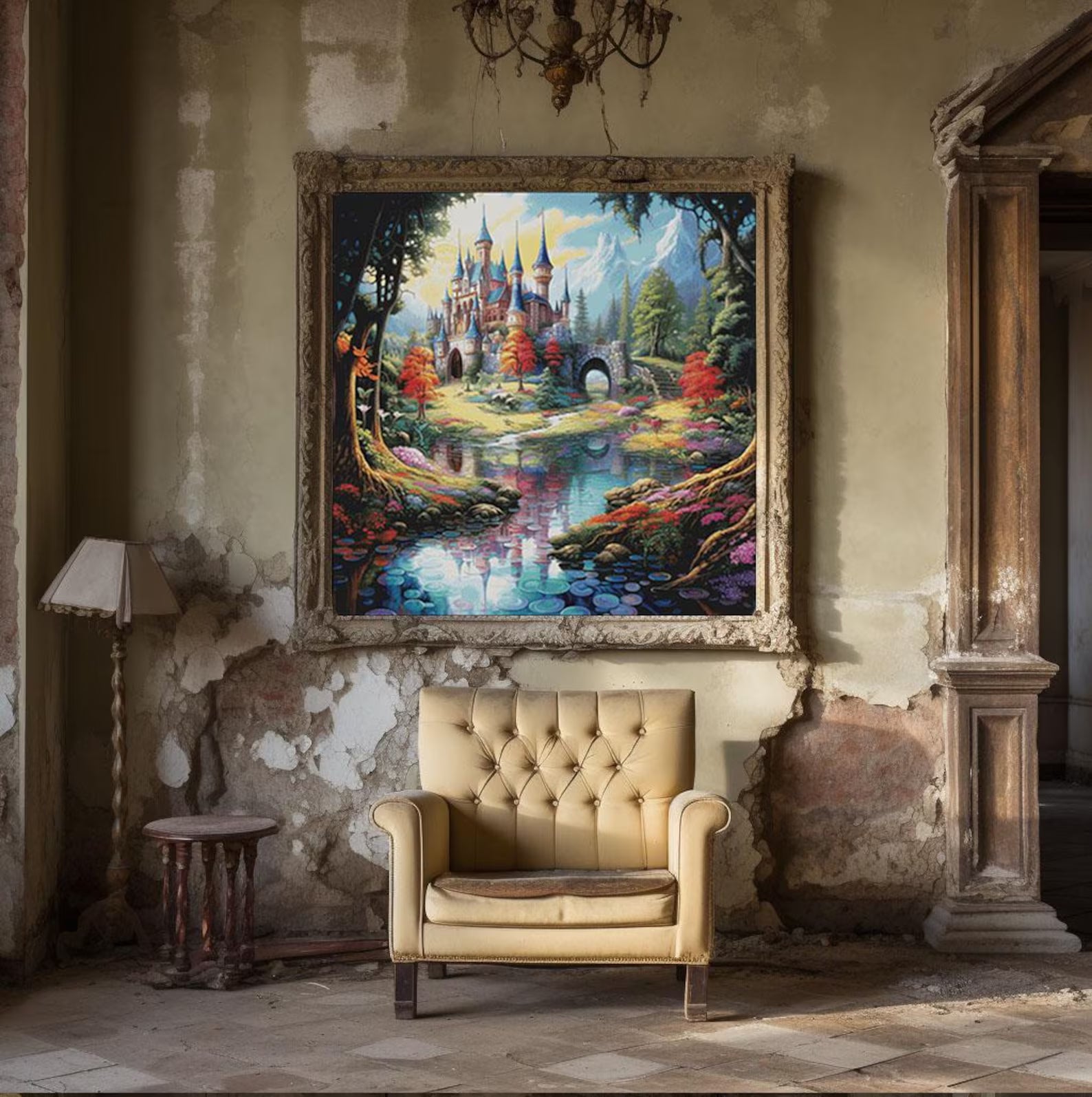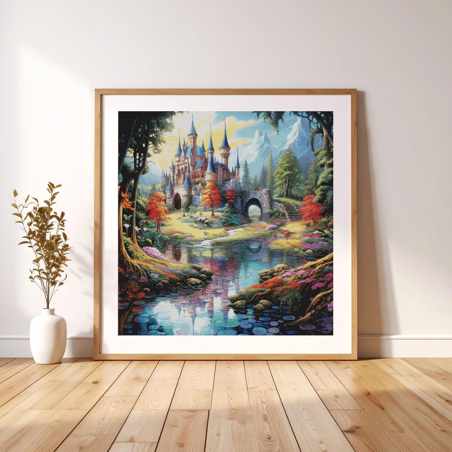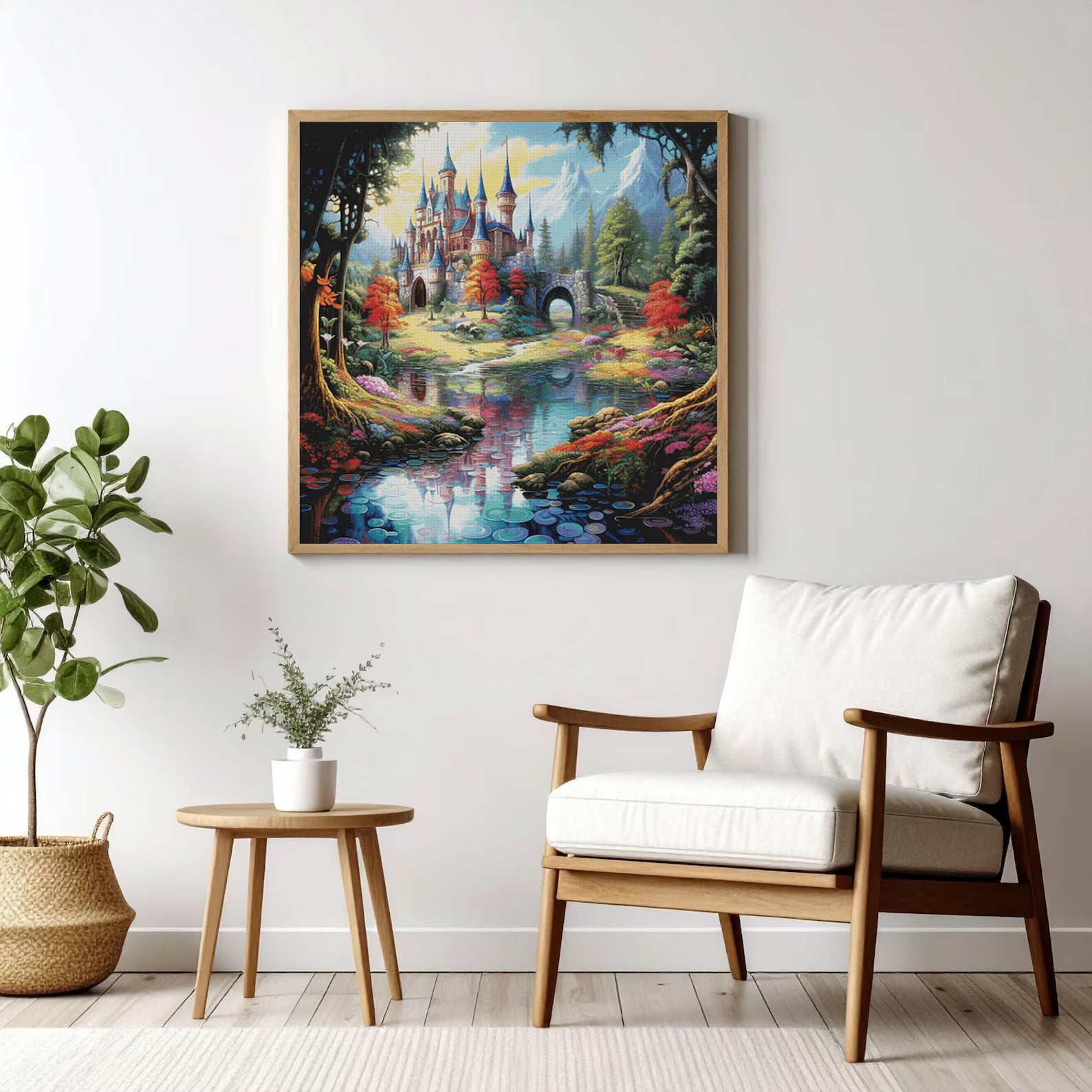 A cross stitch design "Magic castle" that will ideally decorate the interior of your living room or children's room.
