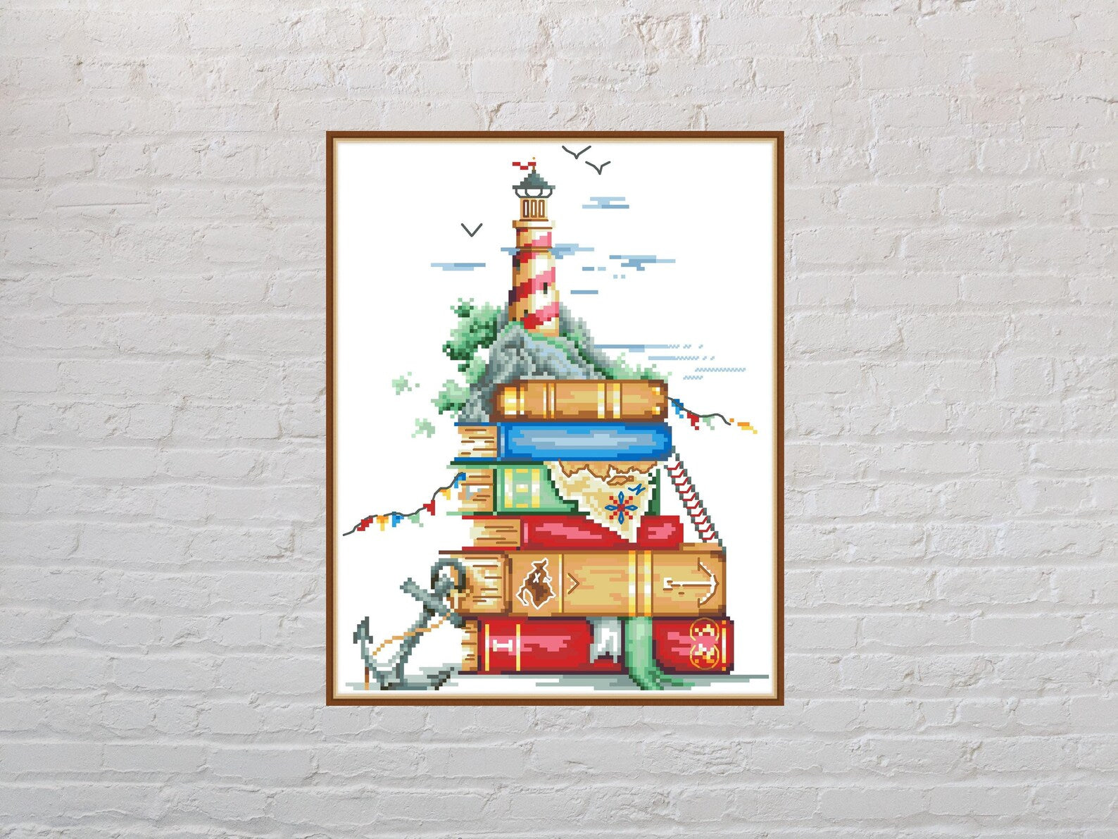 Cross stitch pattern Sea of Books, vintage cross stitch, nature embroidery, lighthouse, anchor, digital PDF file, printable cross stitch