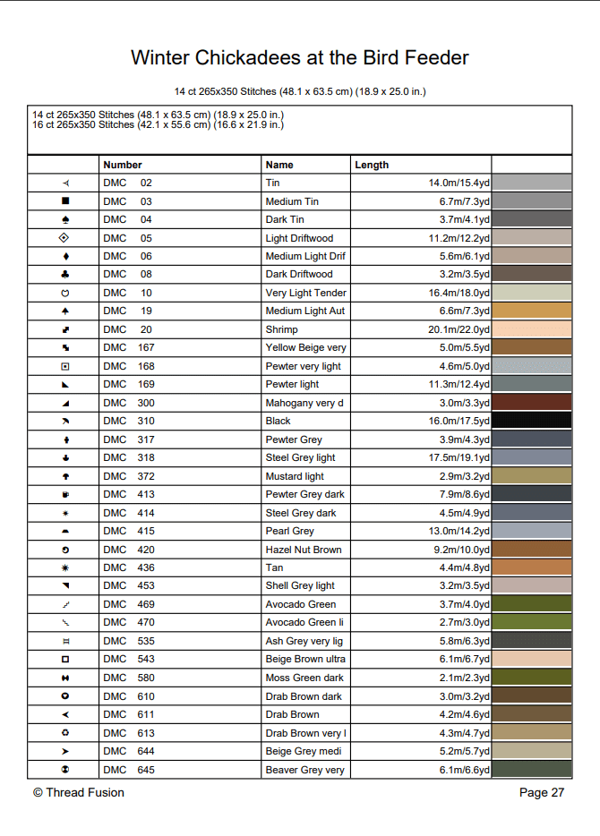 - DMC thread key with symbols and floss numbers