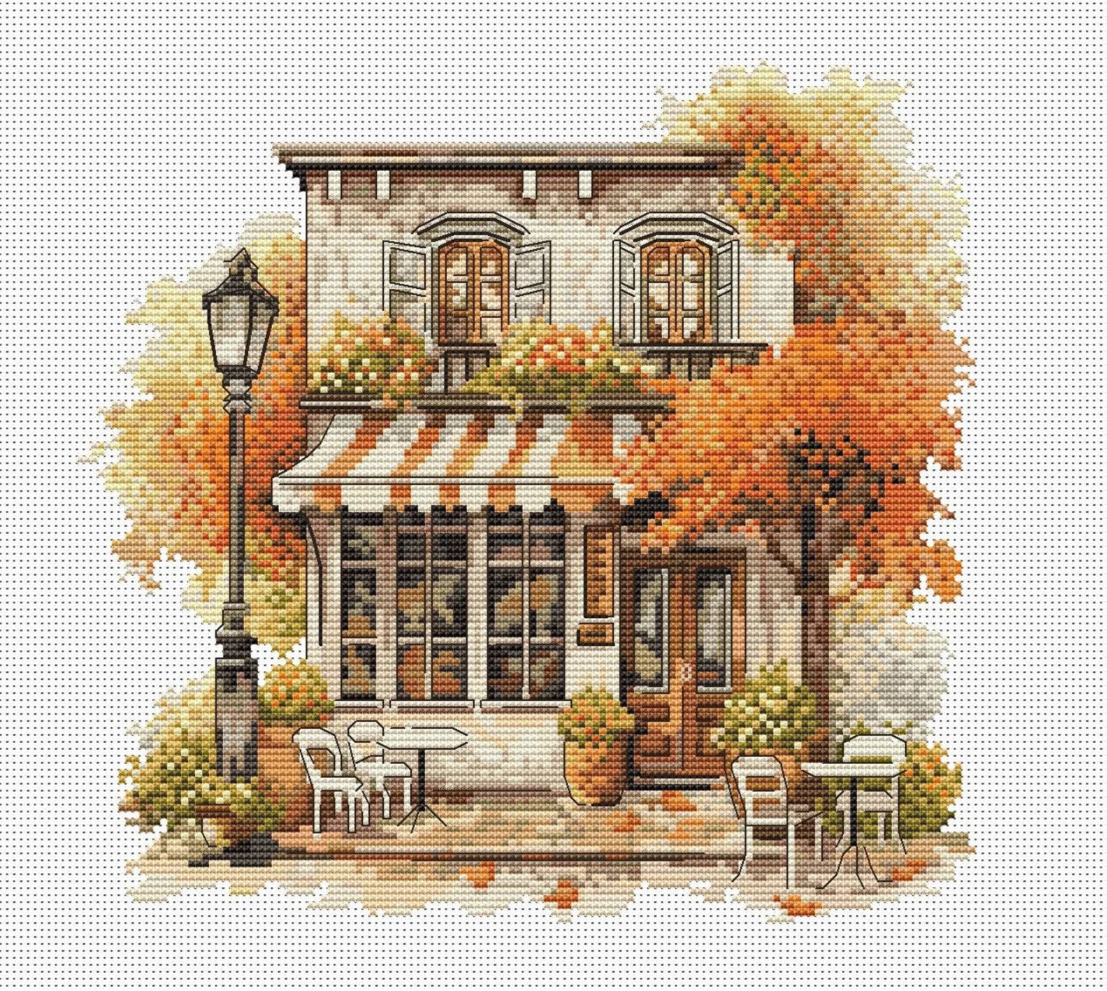 Offering a digital PDF cross stitch pattern "Autumn Cafe" by Defiro