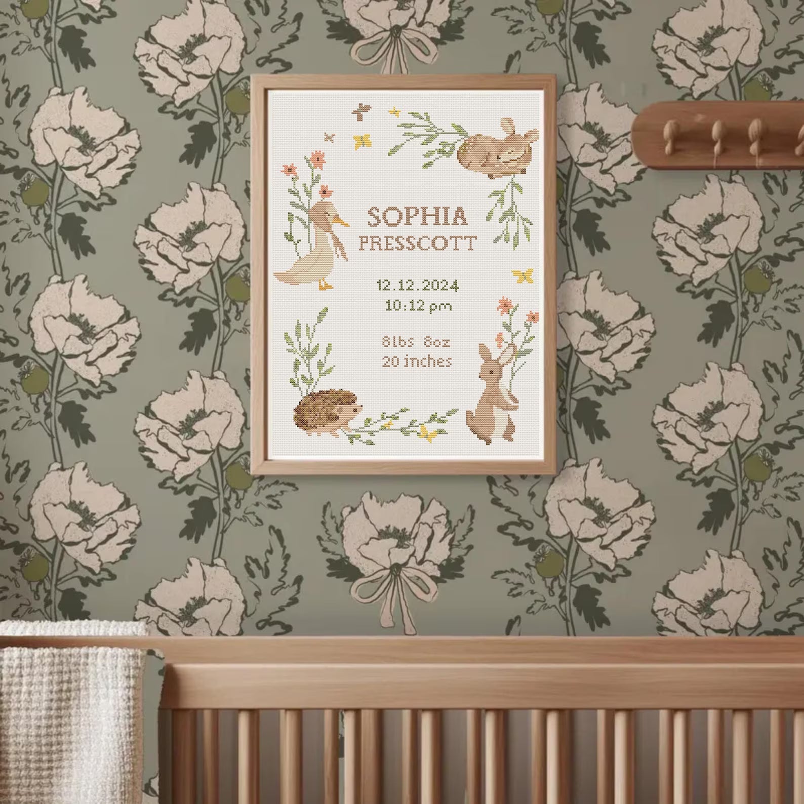 Baby Birth Announcement Cross Stitch Pattern, Customizable Floral Animal Embroidery PDF, Modern Girl Boy Nursery Decor, DIY Baby Shower Gift