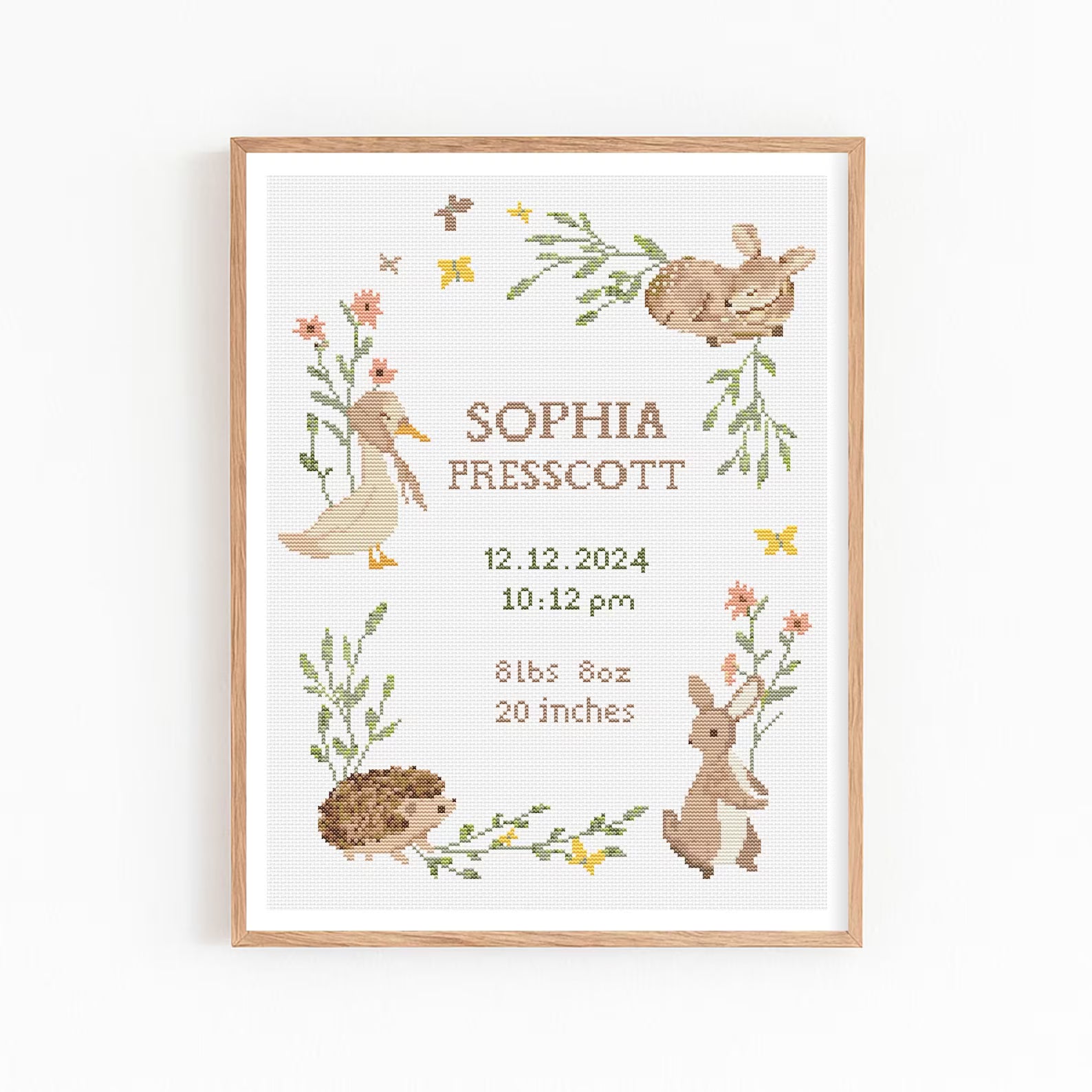 Step into a fairytale forest with this enchanting woodland baby birth announcement cross stitch pattern. Featuring sweet bunnies, a gentle fawn, a cheerful duckling, and an adorable hedgehog nestled among delicate wildflowers, this nature-inspired design brings a touch of magic and warmth to your nursery decor. Personalize the pattern with your baby’s name, birth date, weight, and time to create a truly meaningful keepsake.