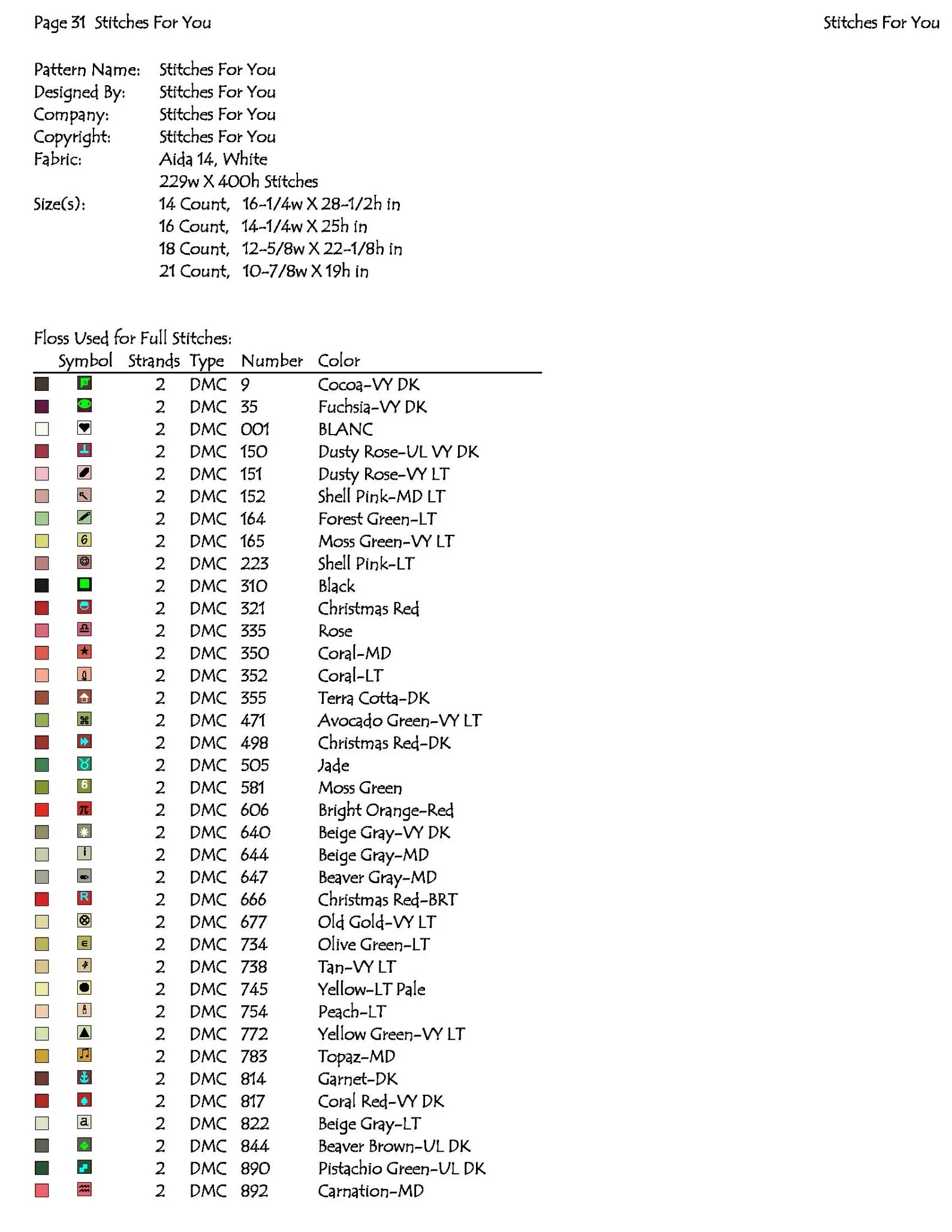 3.size chart for all counts from 14 count Aida