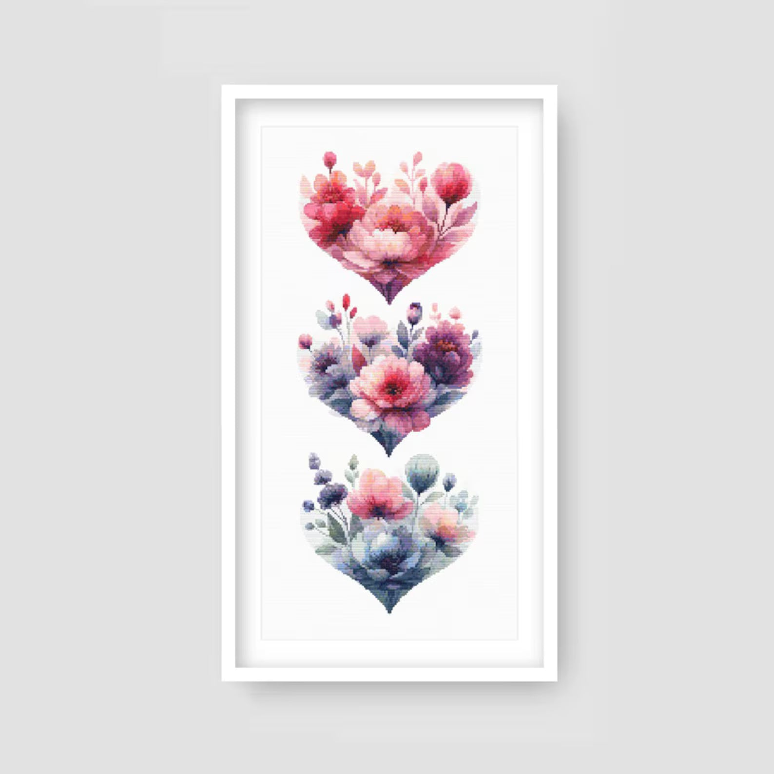 This stunning Flower Heart Cross Stitch Pattern is perfect for the advanced stitcher looking for something unique. Our Blooming Hearts Trio pattern features a delightful blend of botanical beauty and the timeless symbol of love. This digital download offers a striking design featuring three heart-shaped arrangements of flowers, perfect for crafting heartfelt gifts or charming home decor.