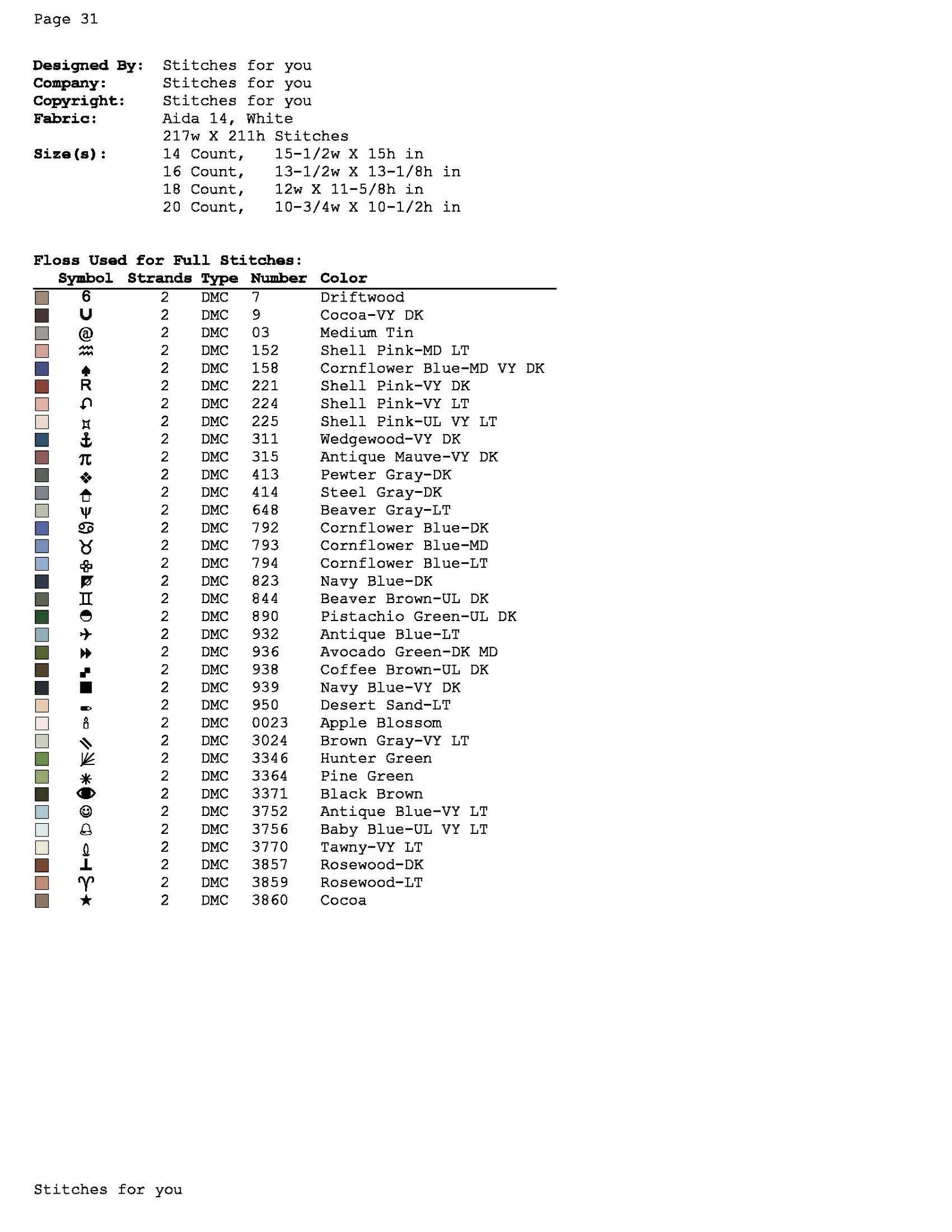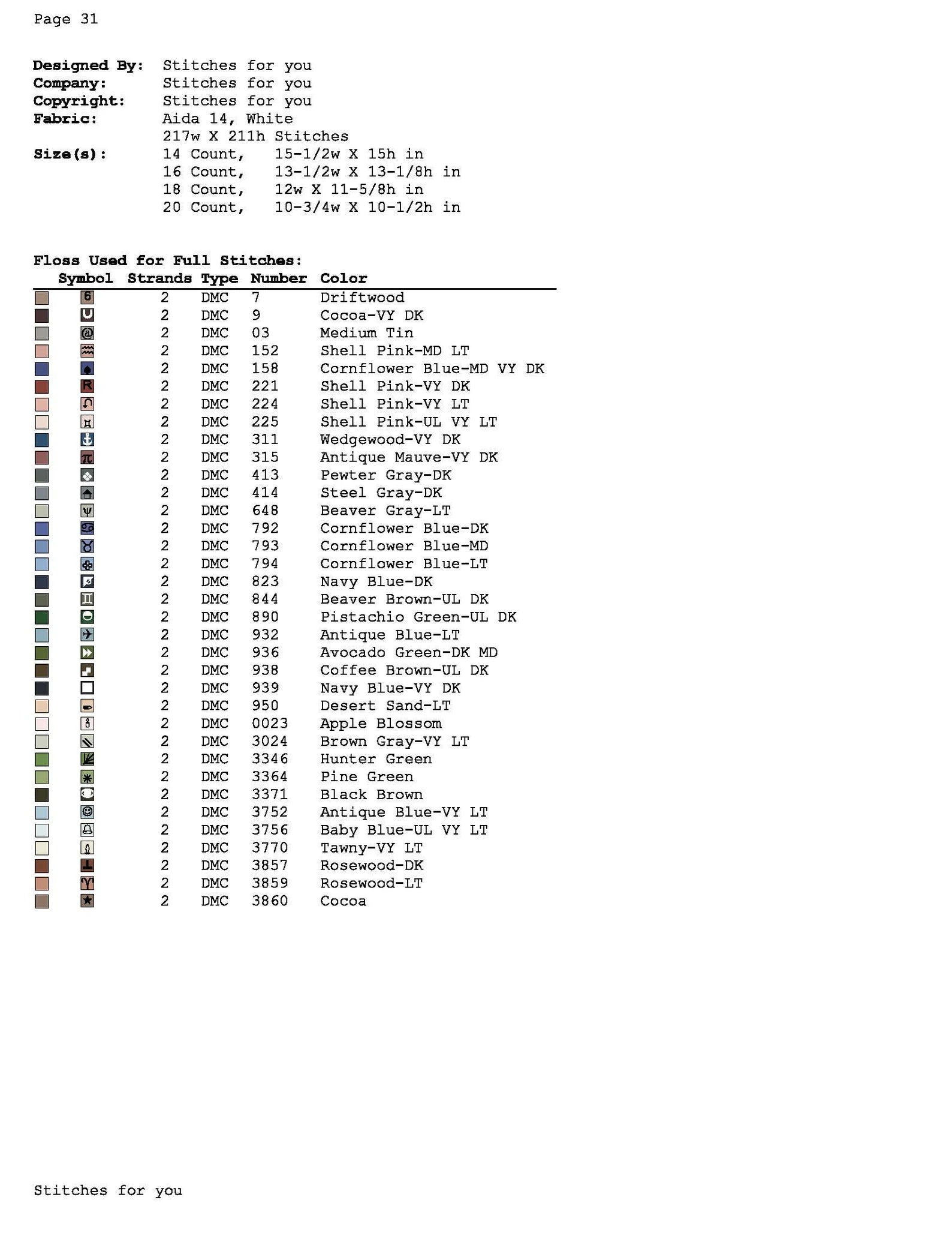 3.size chart for all counts from 14 count Aida