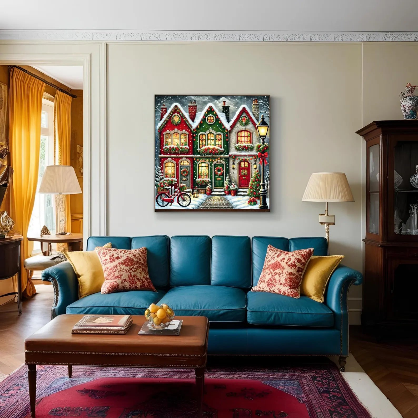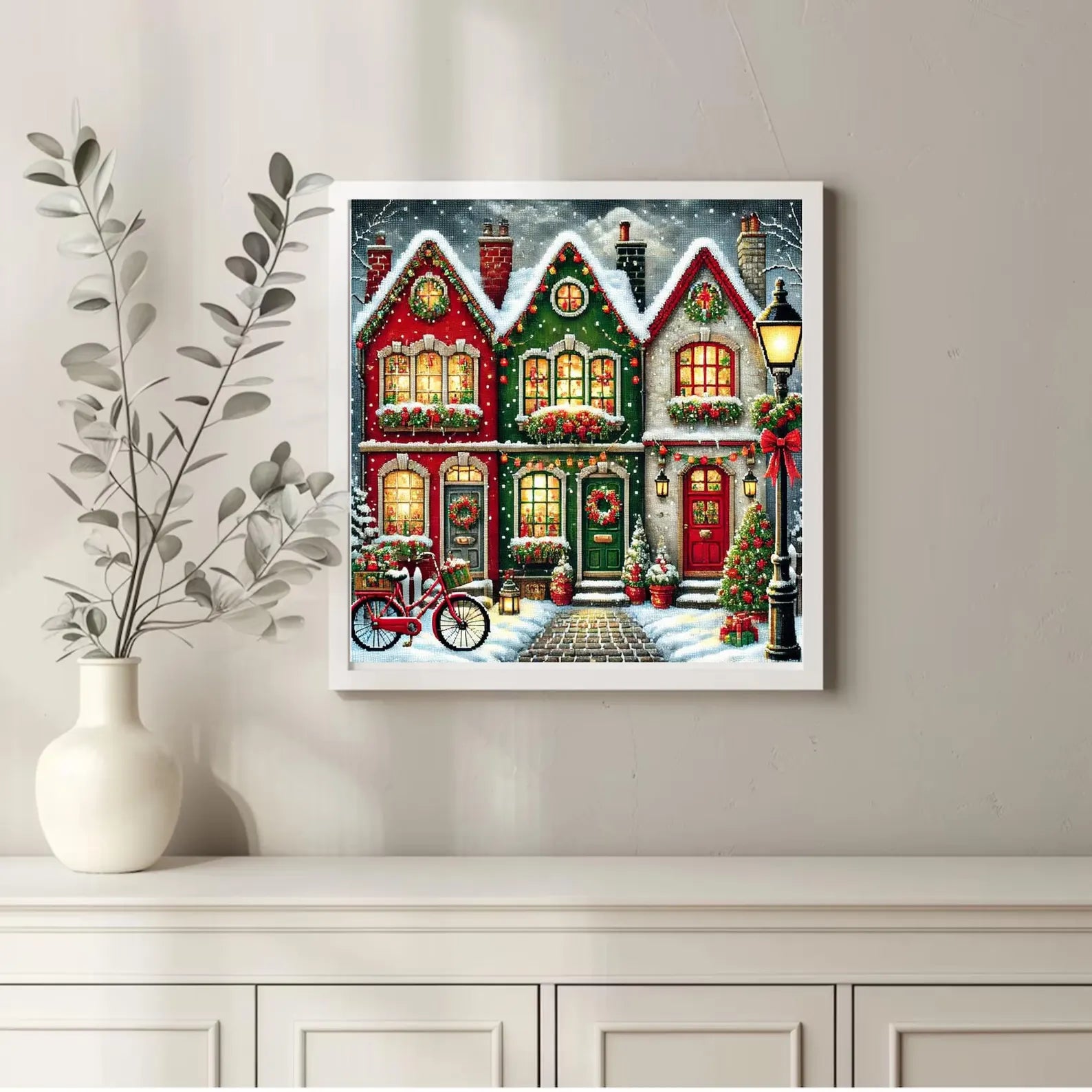 Celebrate the magic of the season with this Christmas Village cross stitch pattern, featuring a cozy row of festive holiday houses adorned with wreaths, snow-covered roofs, glowing windows, and seasonal charm. With intricate details like a red bicycle, lamplight, and Christmas tree, this pattern is perfect for adding warmth to your winter décor or creating a heartfelt handmade gift.