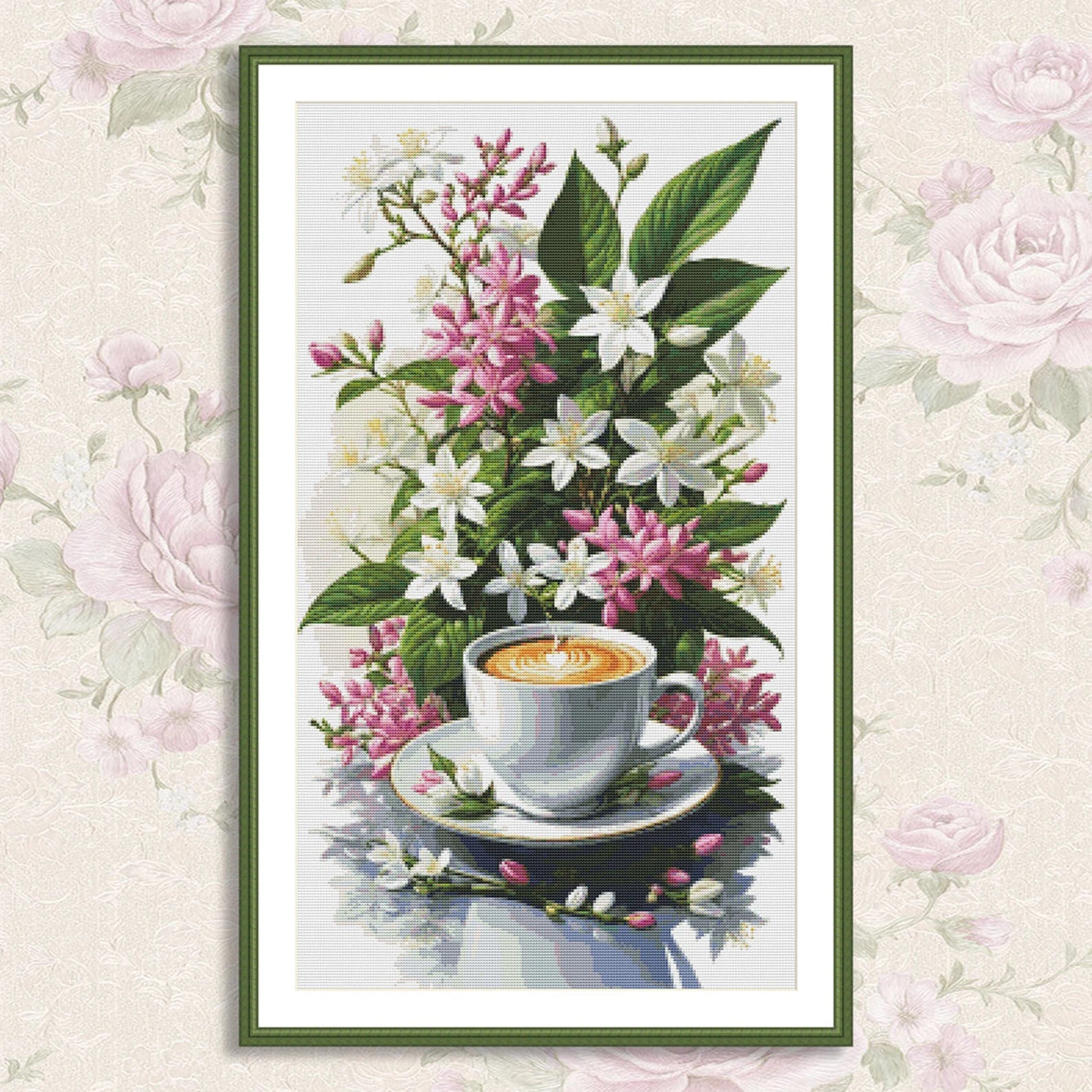 Coffee Time Cross Stitch Pattern Digital Pattern Watercolor Flowers Kitchen Still Life Modern Decor Pattern Cup of coffee Needlepoint chart