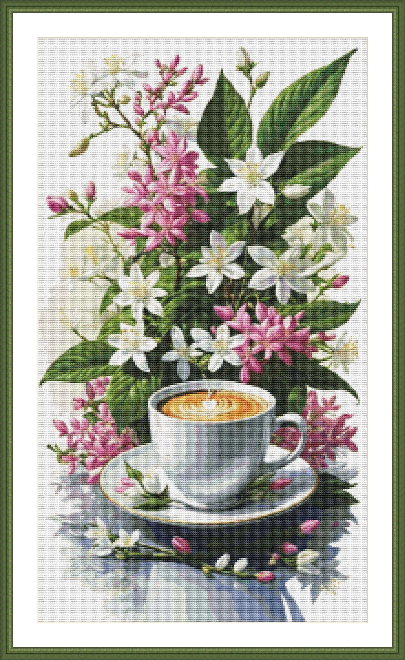Coffee Time Cross Stitch Pattern Digital Pattern Watercolor Flowers Kitchen Still Life Modern Decor Pattern Cup of coffee Needlepoint chart