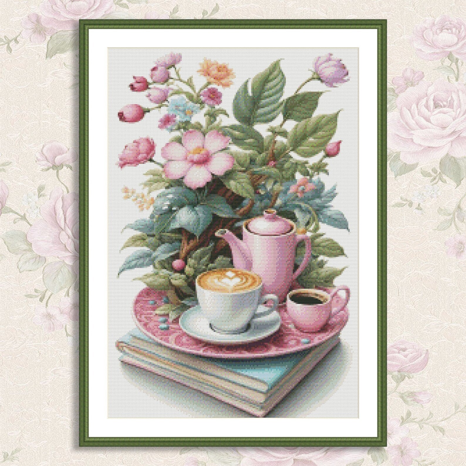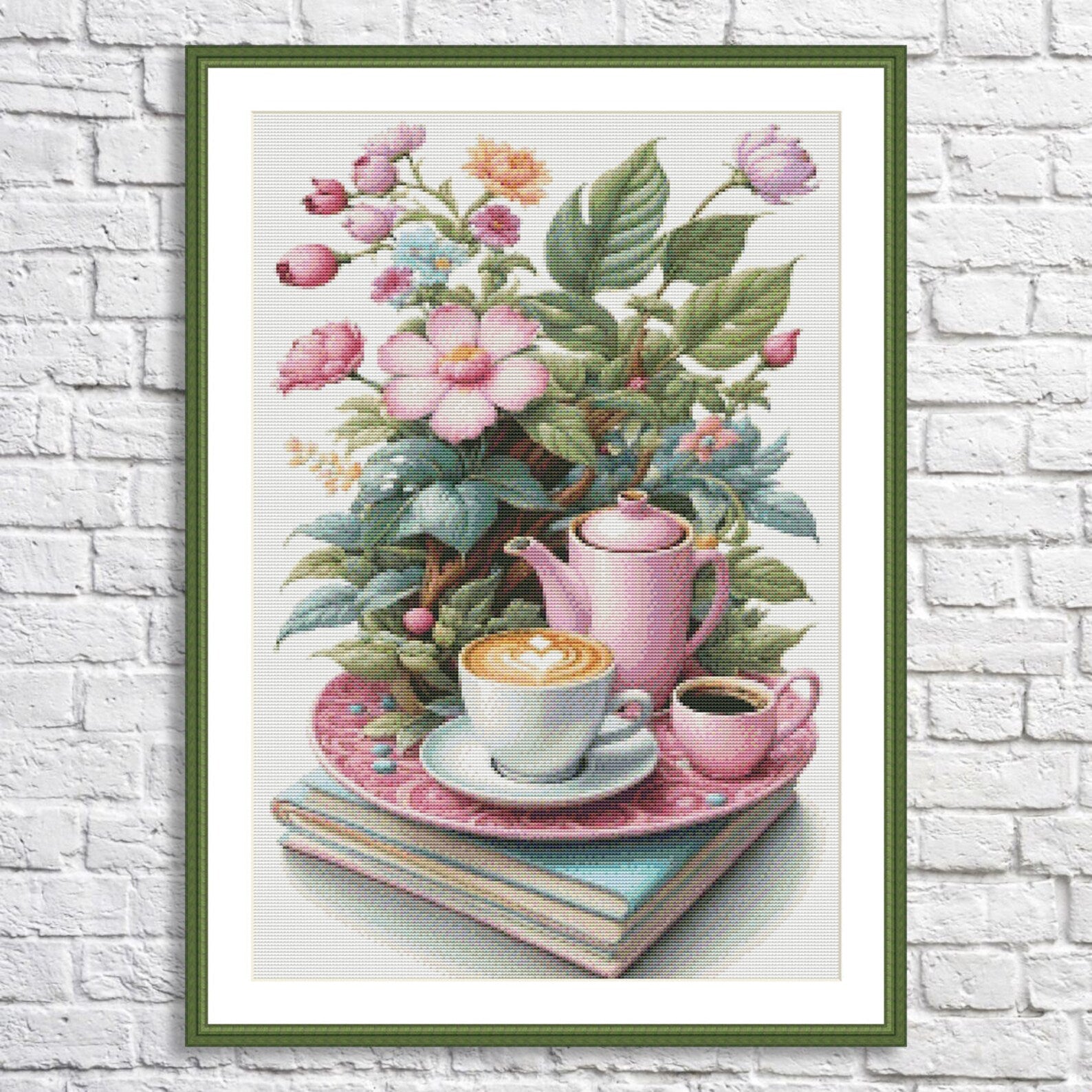 Coffee Time Cross Stitch Pattern Digital Pattern Watercolor Flowers Kitchen Still Life Modern Decor Pattern Cup of coffee Needlepoint chart