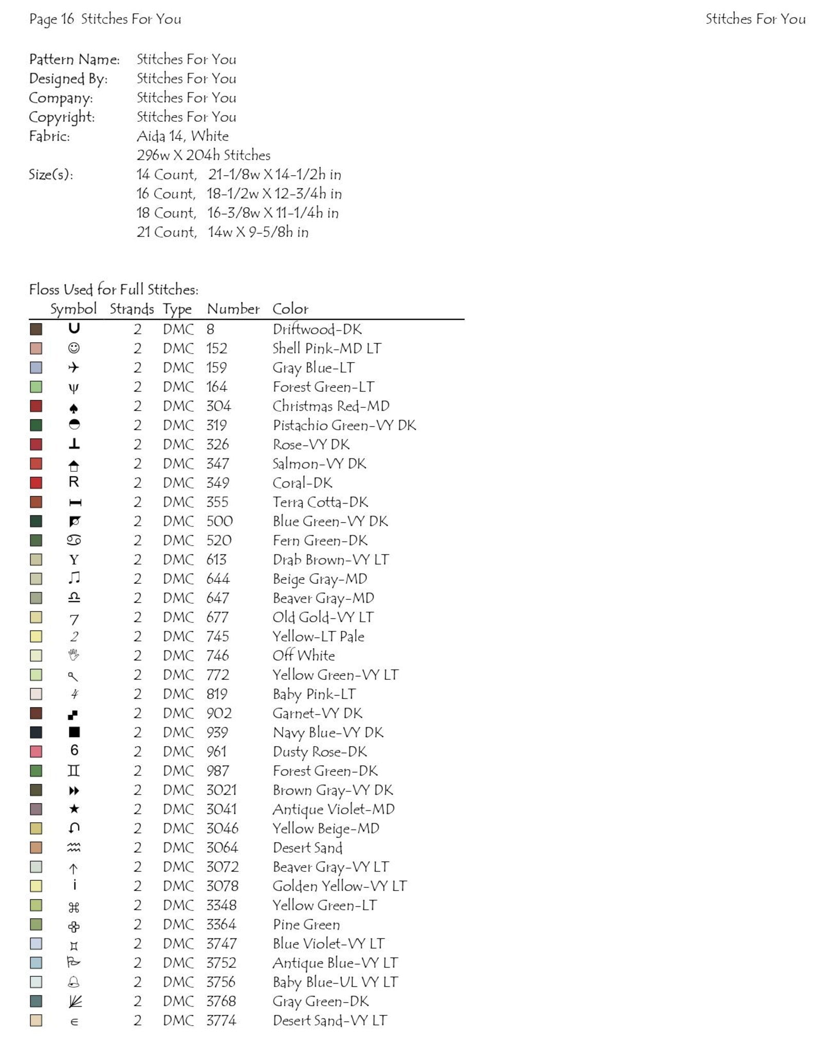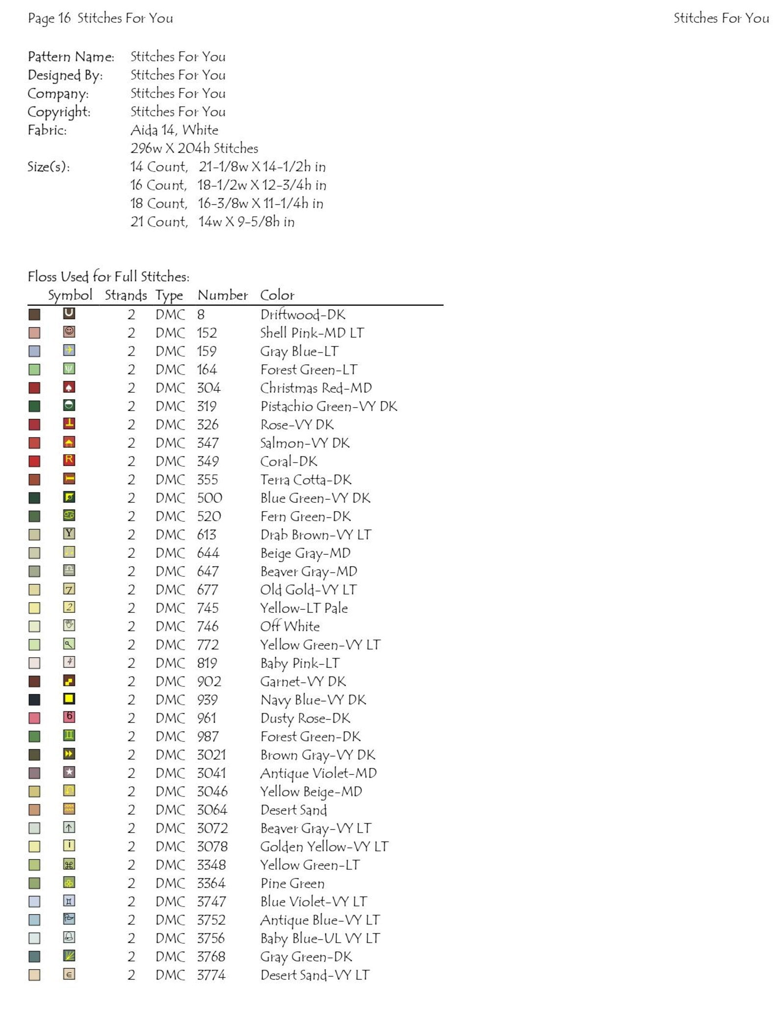 3.size chart for all counts from 14 count Aida