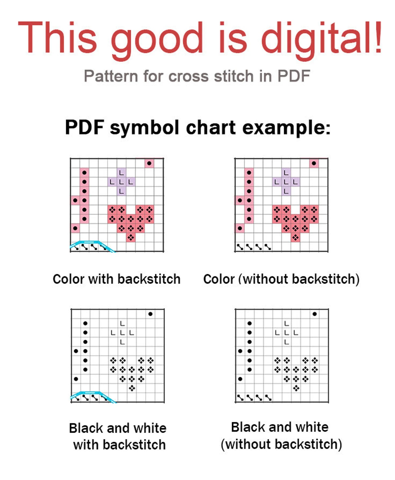 Pattern includes 1 file: black-and-white and color chart (for all patterns) , list of DMC thread colors in PDF