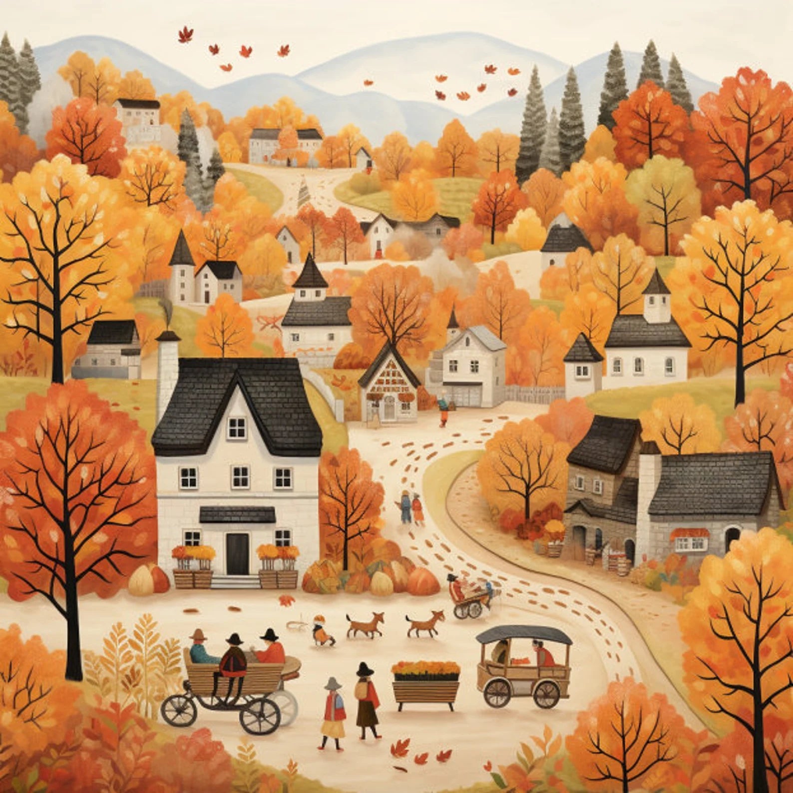 A full coverage cross stitch pattern of Little Town in Autumn.