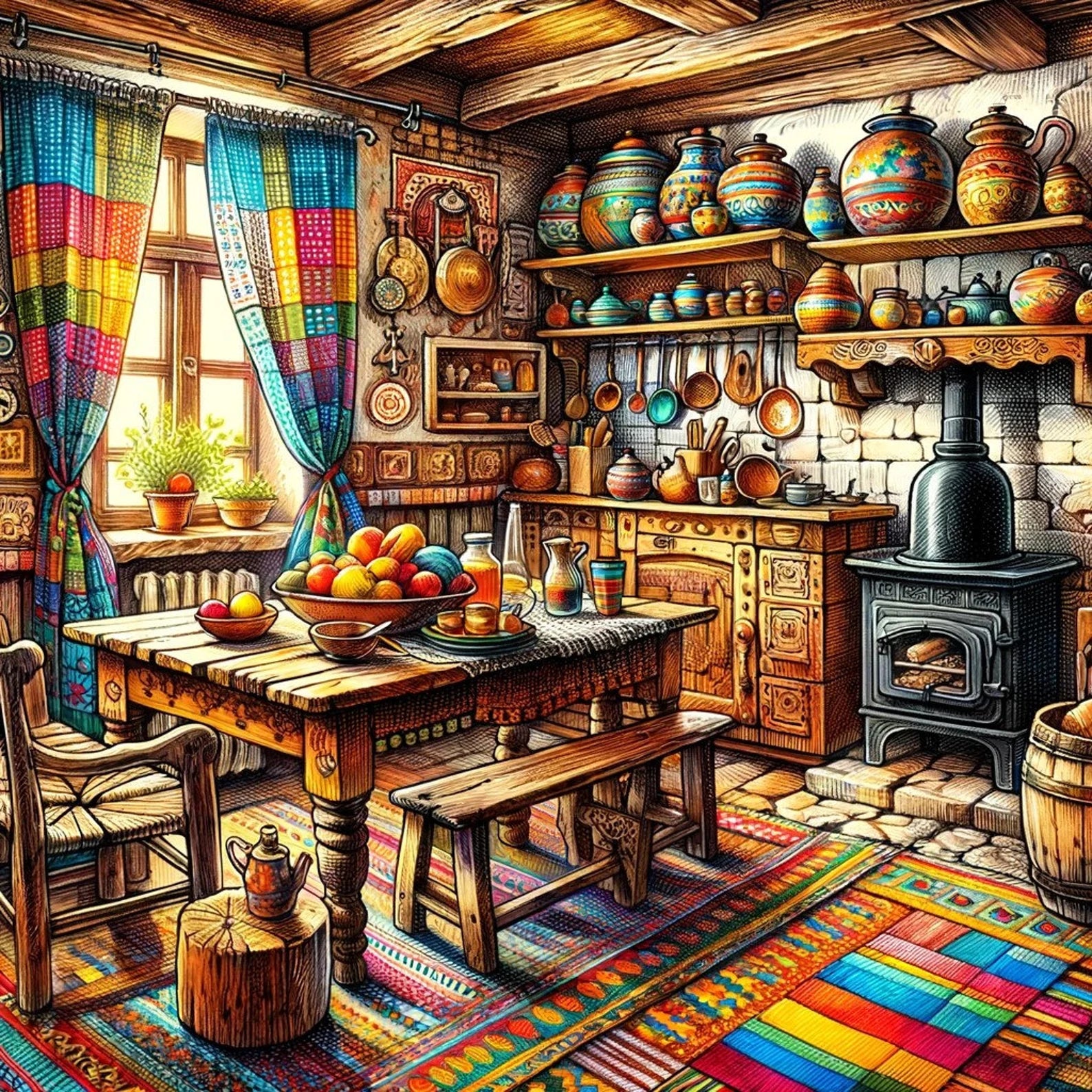 A full coverage cross stitch pattern of Mexican Kitchen.