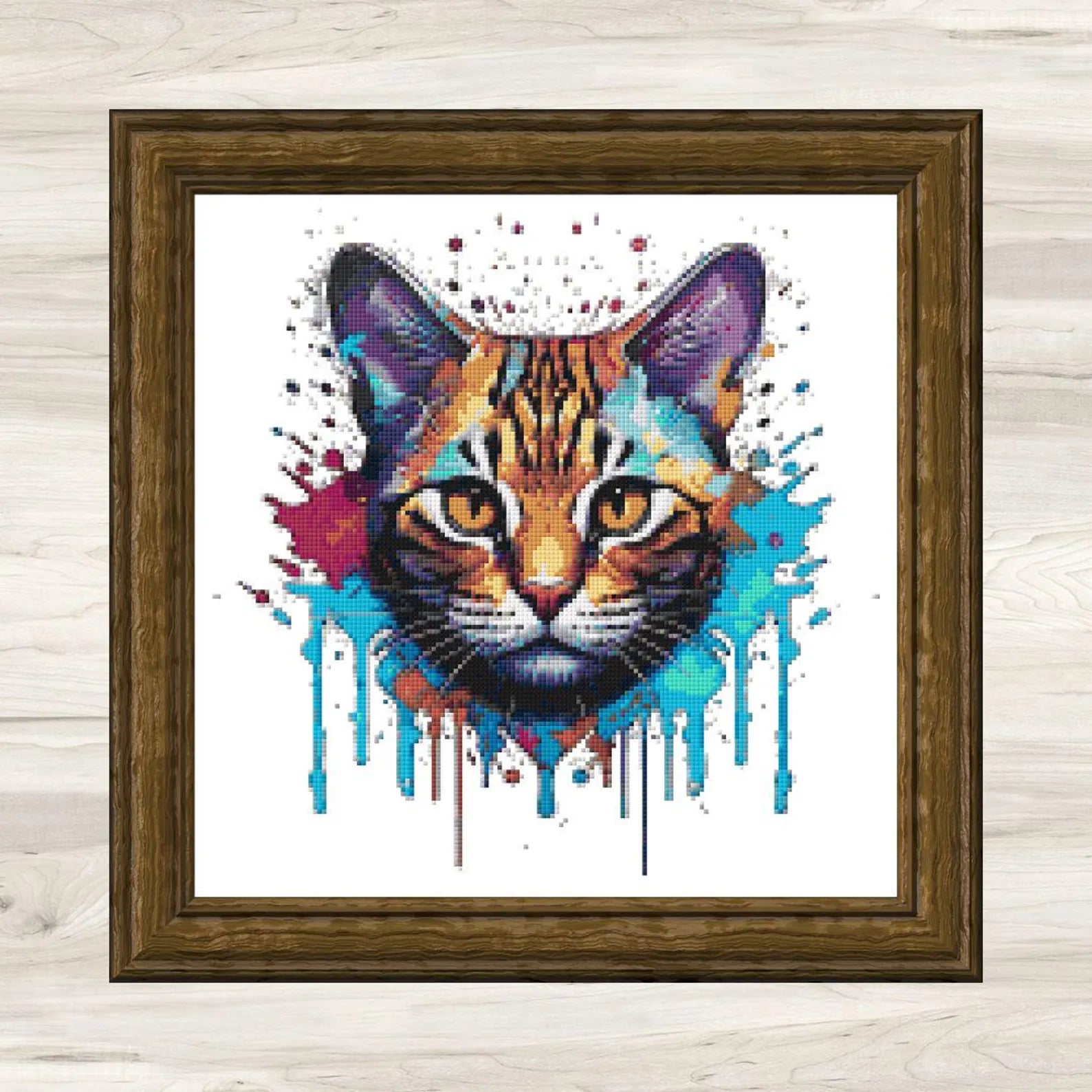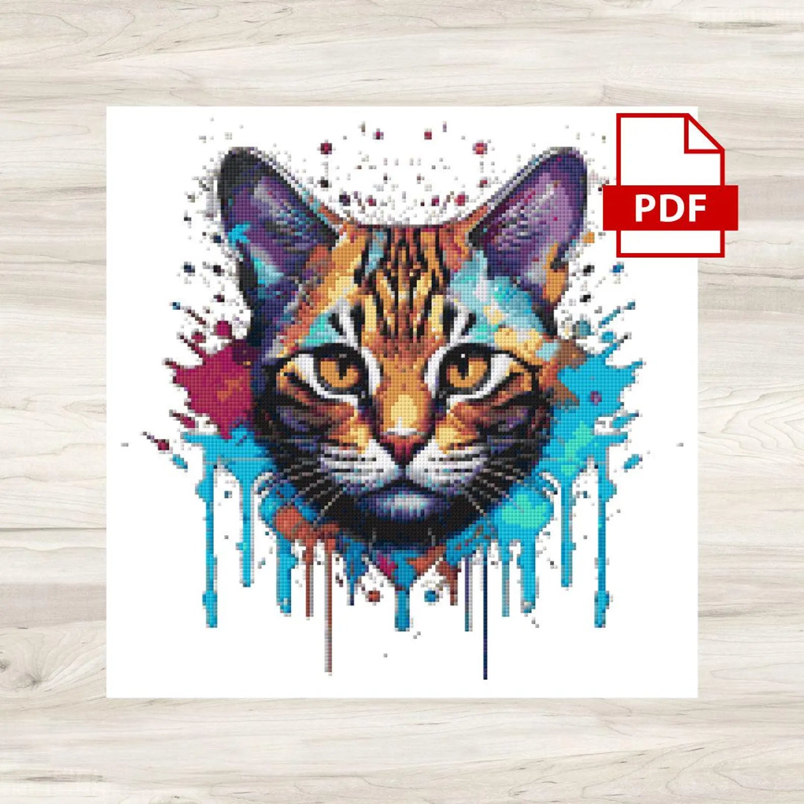 Cross stitch pattern for Splatter Cat Art Motif 1. This is a digital cross stitch pattern only. It can be printed and is also suitable for onscreen viewing (PC, tablet, smartphone). No kits, fabric, floss, or other materials are included in this listing.