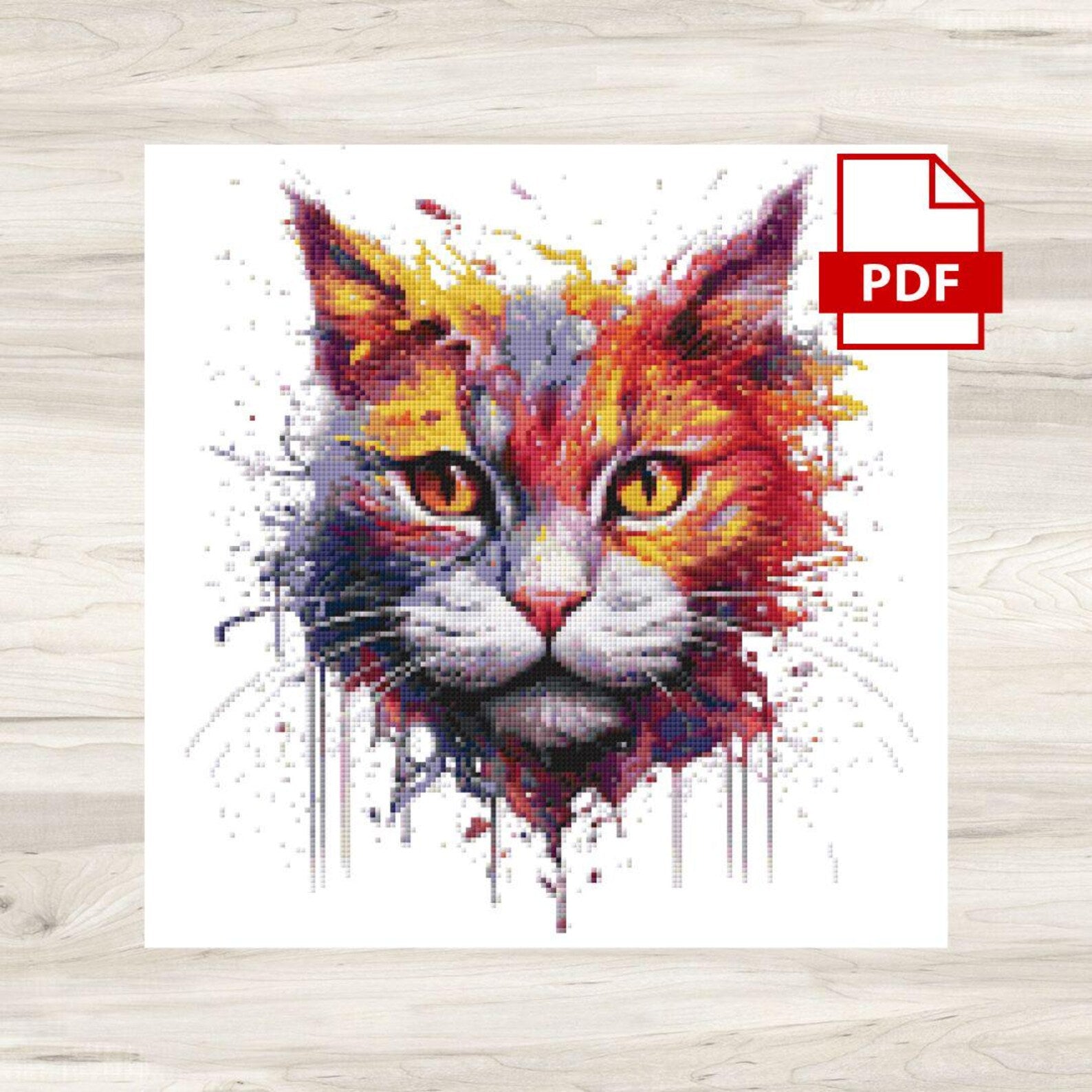 Cross stitch pattern for Splatter Cat Art Motif 4. This is a digital cross stitch pattern only. It can be printed and is also suitable for onscreen viewing (PC, tablet, smartphone). No kits, fabric, floss, or other materials are included in this listing.
