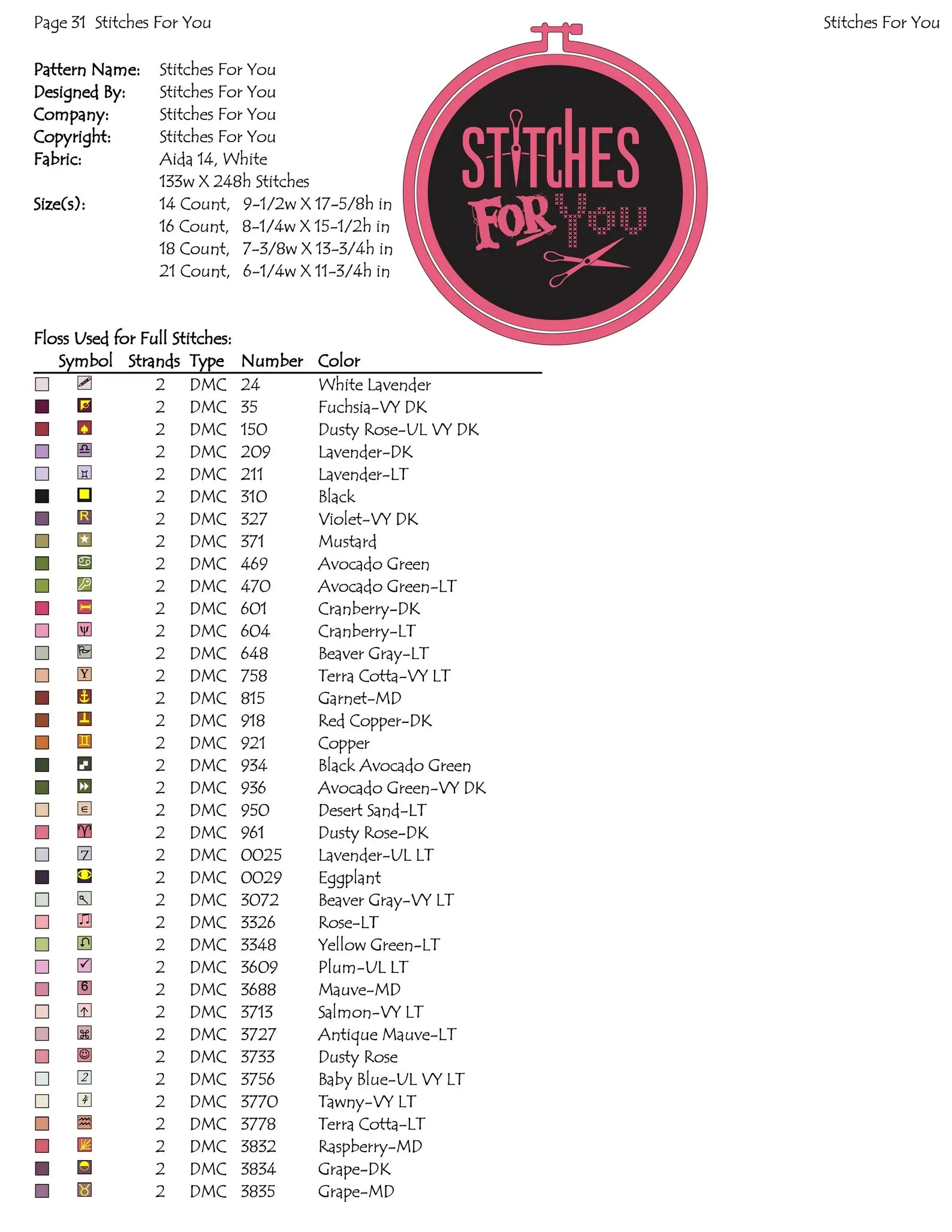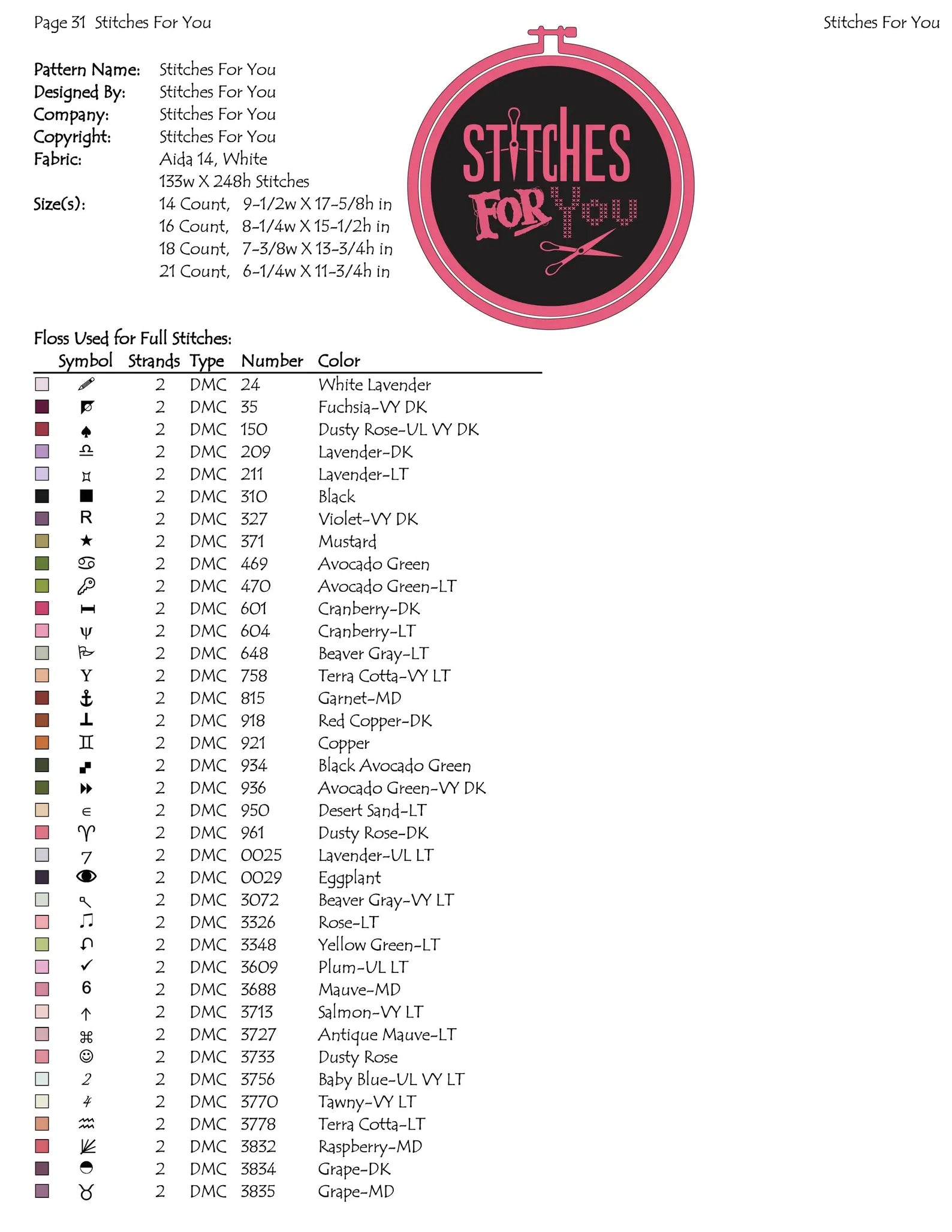 3.size chart for all counts from 14 count Aida
