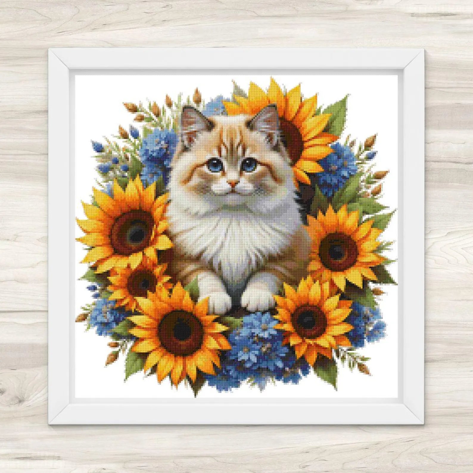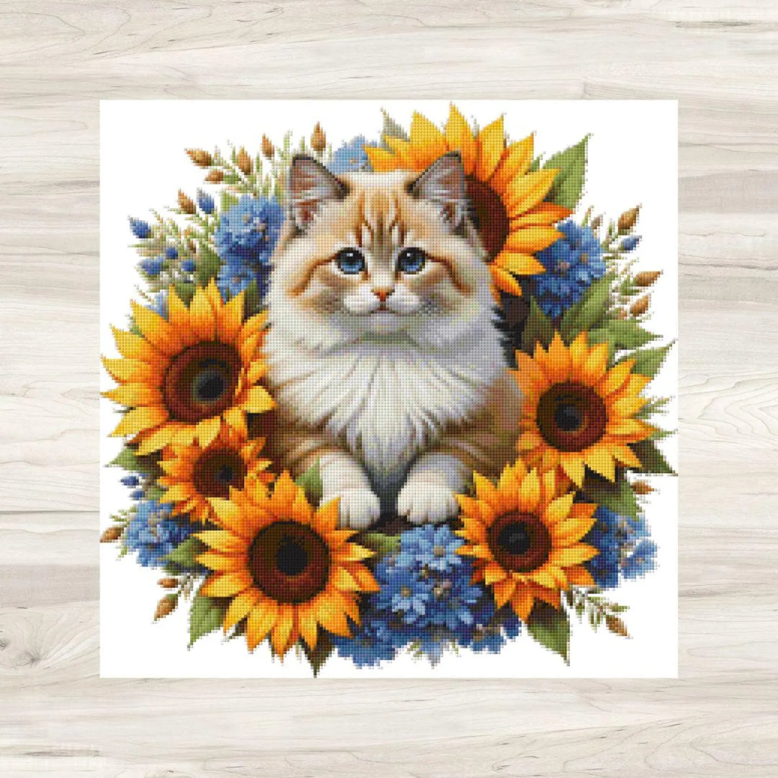 Fluffy Cat and Sunflowers Cross Stitch Pattern PDF – Floral Feline Embroidery Chart – Romantic Cat Lover Needlepoint Design