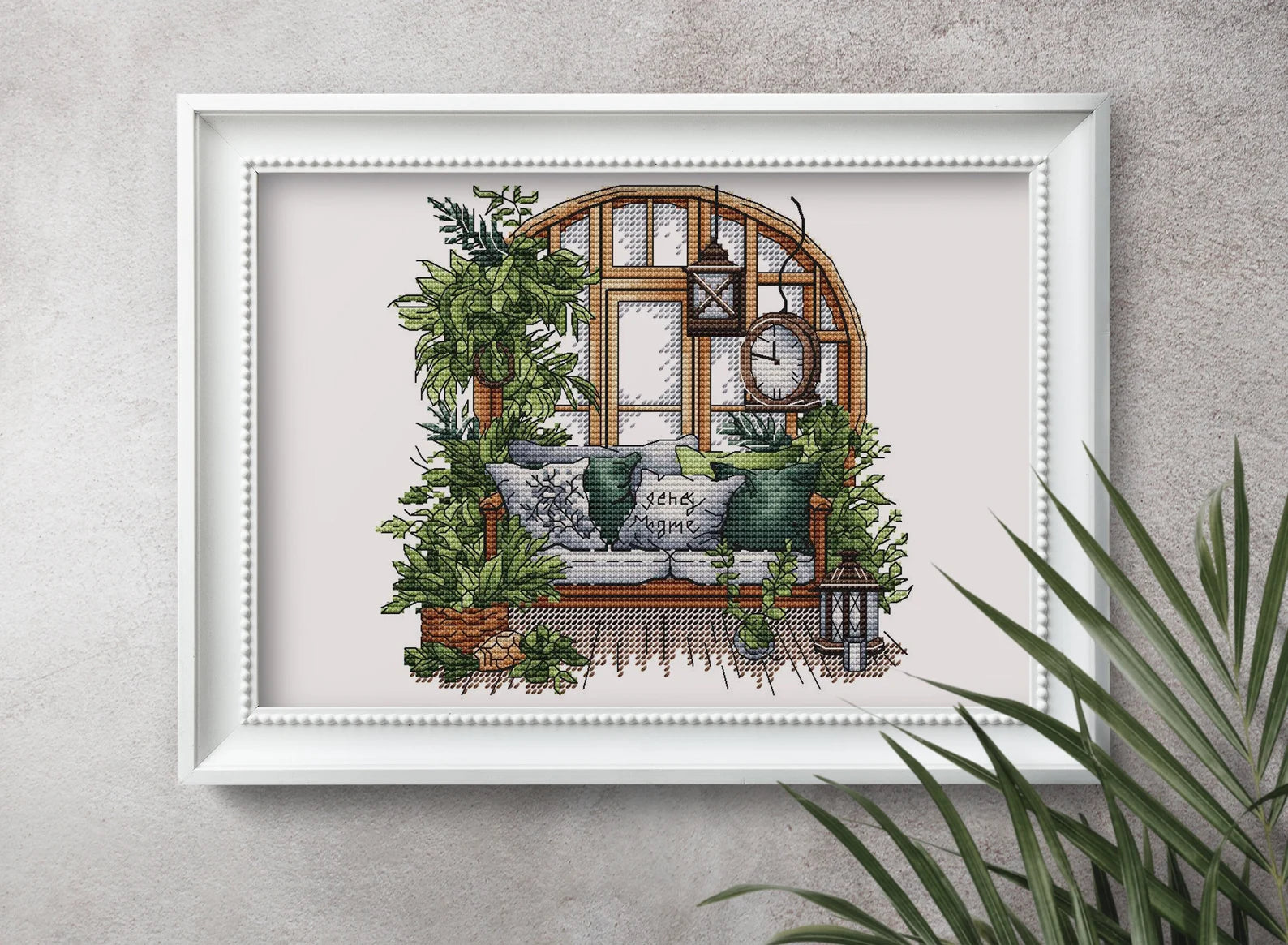 Garden Pattern for Cross Stitch, Interior Embroidery PDF, Green Garden Embroidery PDF, Terrace window cross stitch, Embroidery decor