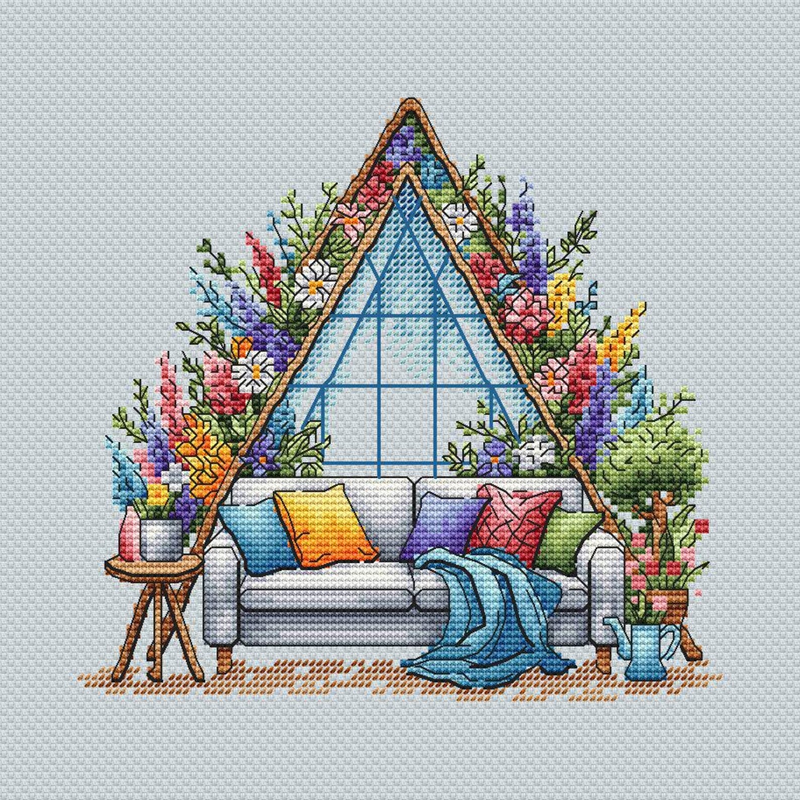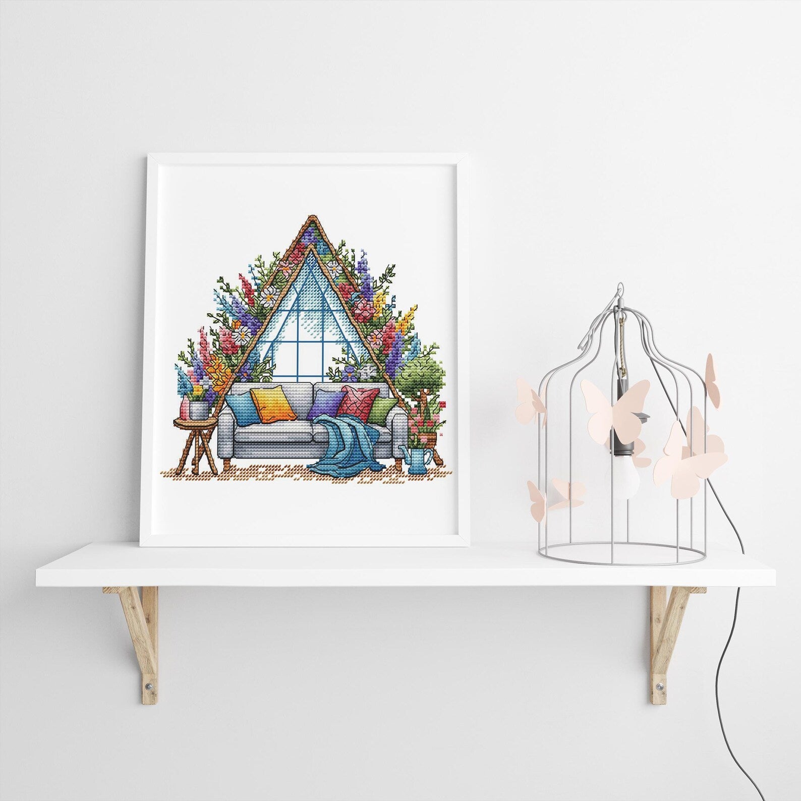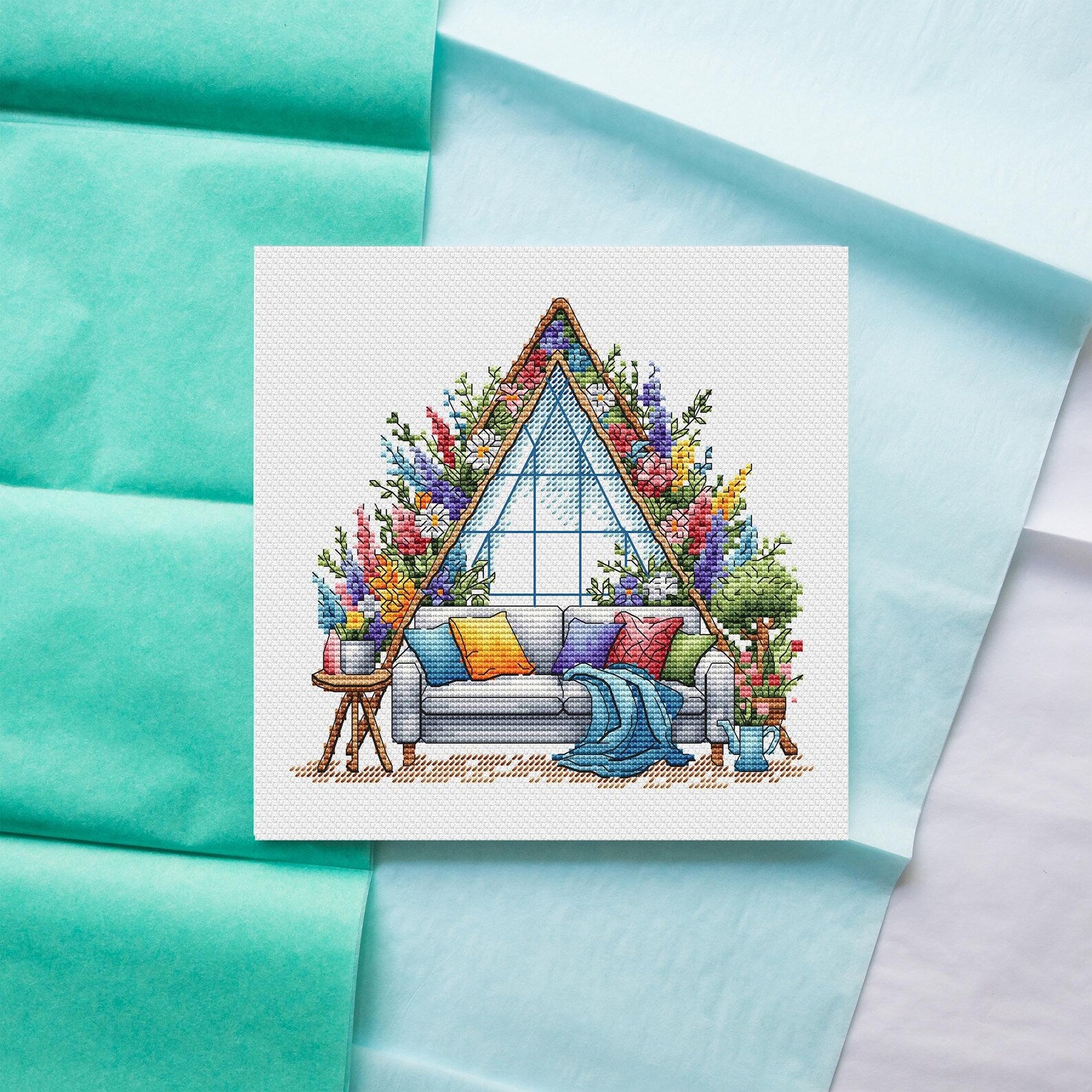 Garden Pattern for Cross Stitch, Spring Embroidery PDF, Green Garden Embroidery PDF, Terrace window cross stitch, Embroidery Counted Cross