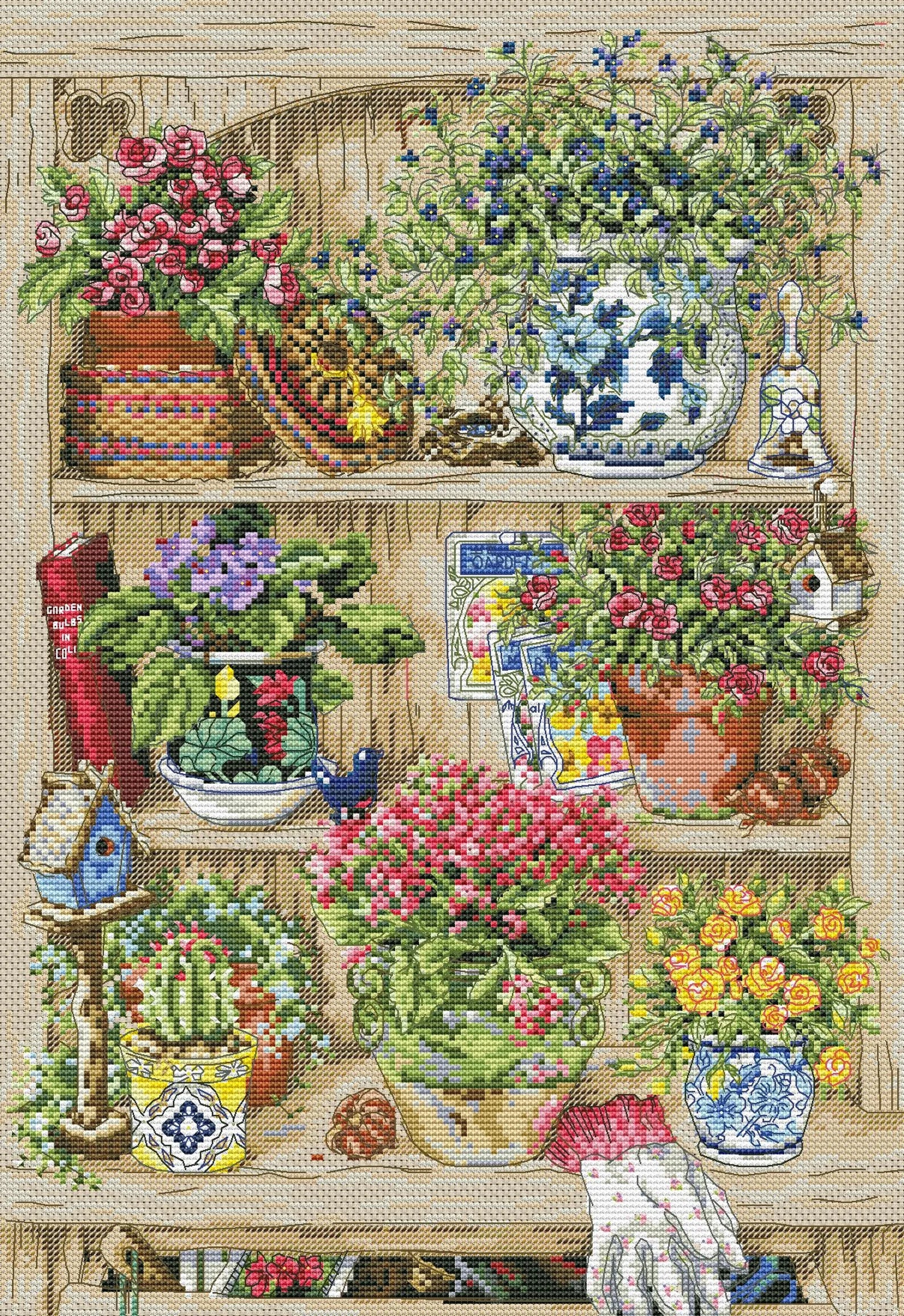 Garden Shelf, Counted Cross Stitch pattern, Kitchen Still Life, Garden Bits And Bobs, Home Modern Decor, Instant Download PDF, Flower pots