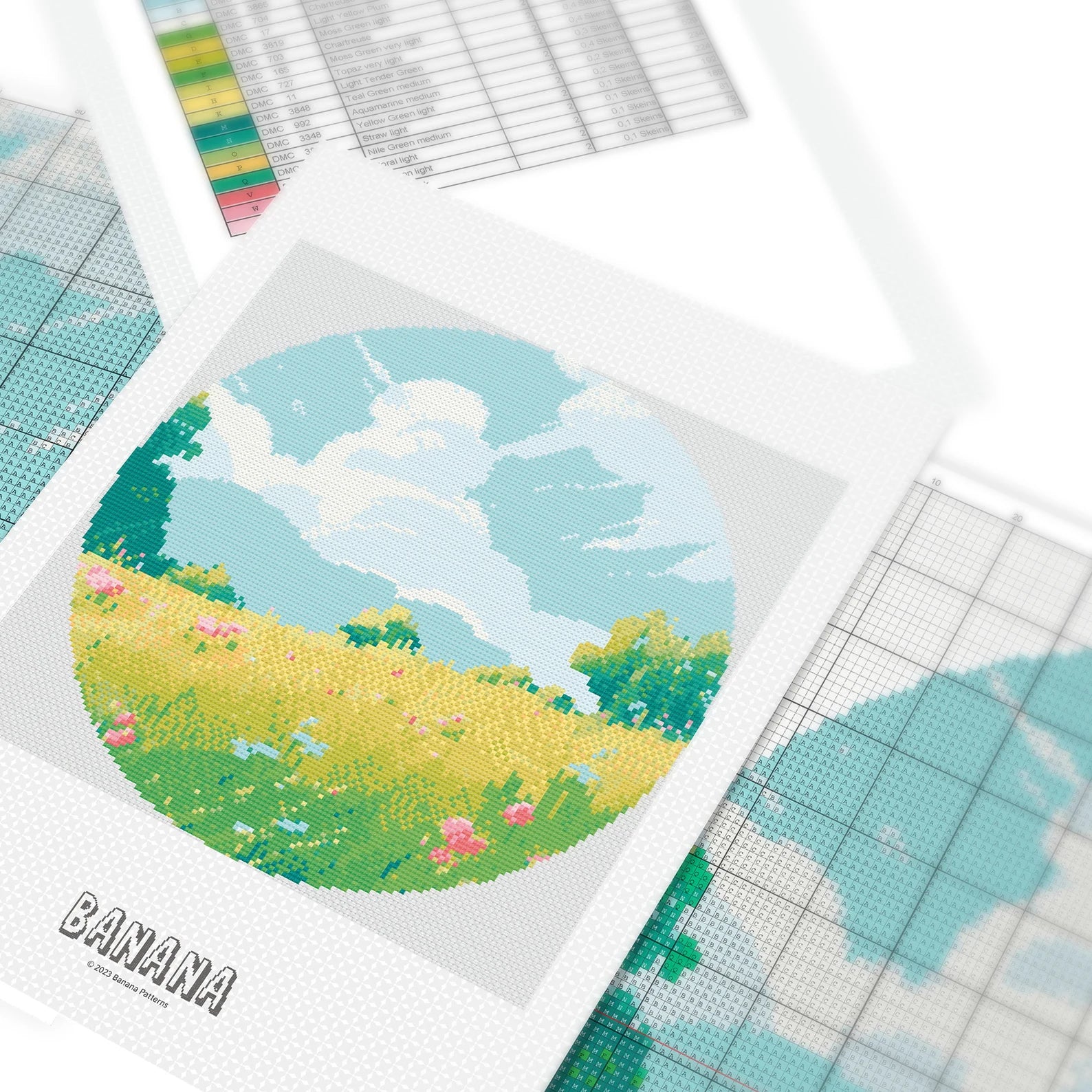 Ghibli inspired Meadow Cross Stitch Pattern | Anime Landscape Cross Stitch Chart Download | Nature Cross Stitch | Large Modern Cross Stitch
