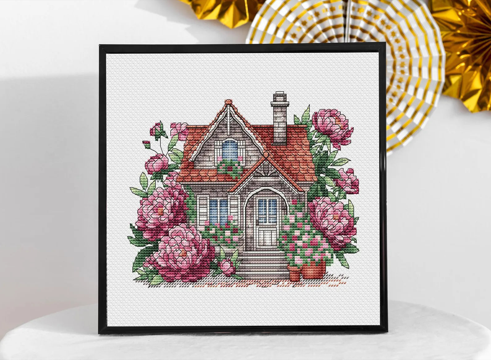 This cozy house surrounded by lush peonies is a dream come true for any cross stitch lover. The detailed roof, windows, and flowers convey warmth and tranquility. Cross stitch embroidery lets you create your own fairytale, where every stitch is a piece of love.