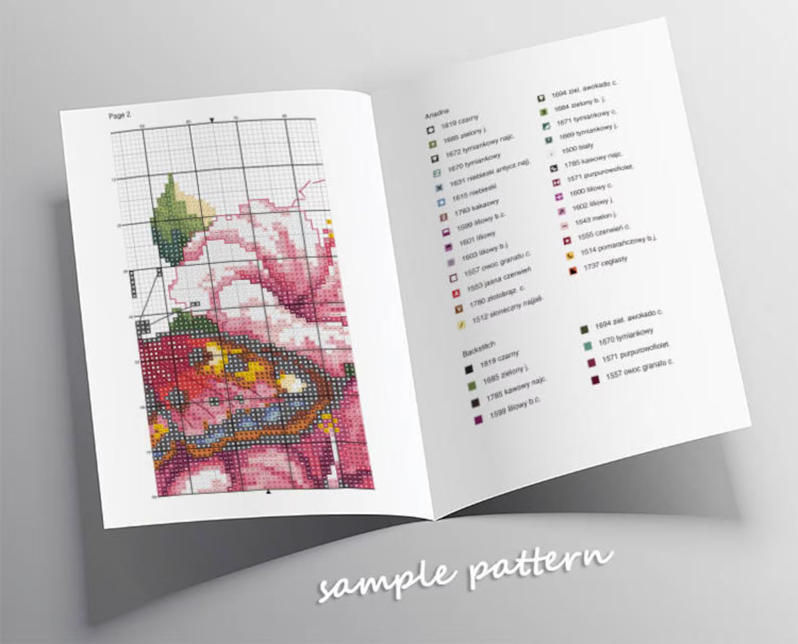 The pattern is downloadable as a color pattern diagram with a list of Anchor, Ariadna, DMC, Madeira mouline, as a pdf and .hks file.