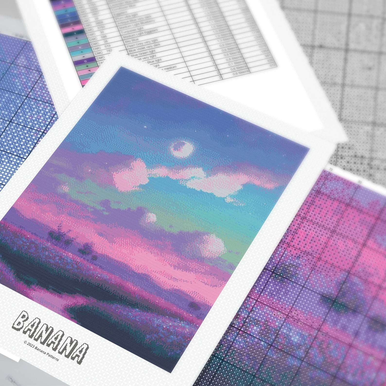 Lavender Landscape Cross Stitch Pattern | Lofi Moon Cross Stitch Chart Download | Nature Cross Stitch | Large Counted Cross Stitch PDF