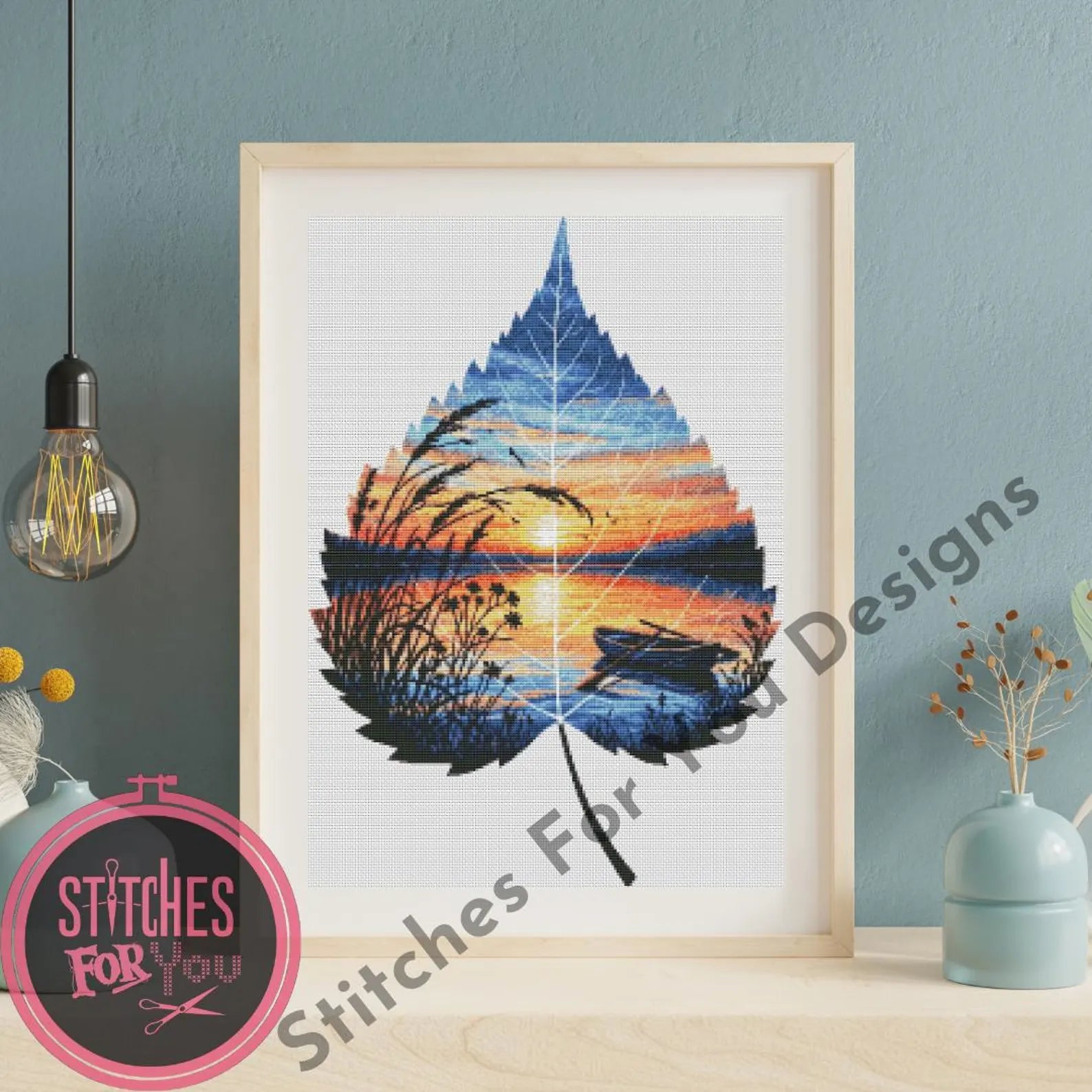 Leafscape Sunset- Counted Cross Stitch Patterns - Printable Chart PDF Format Needlework Embroidery Crafts DIY DMC color