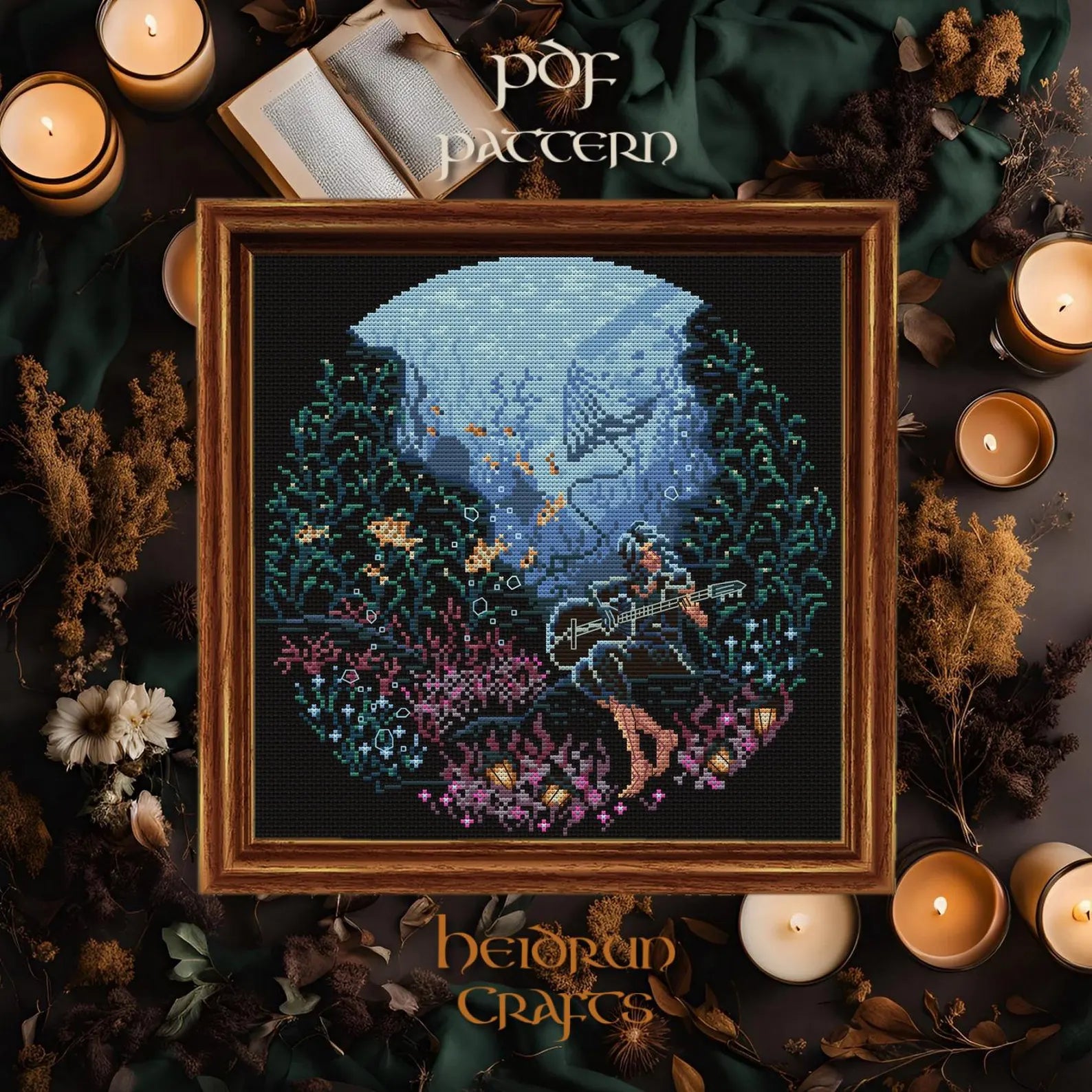 Dive into a tranquil, otherworldly scene with this Lune in Flying Waters Cross Stitch Pattern, inspired by Clair Obscur: Expedition 33. This design captures Lune sitting gracefully on a rock, playing her guitar among glowing corals and luminous flowers, with the shimmering underwater landscape fading behind her.