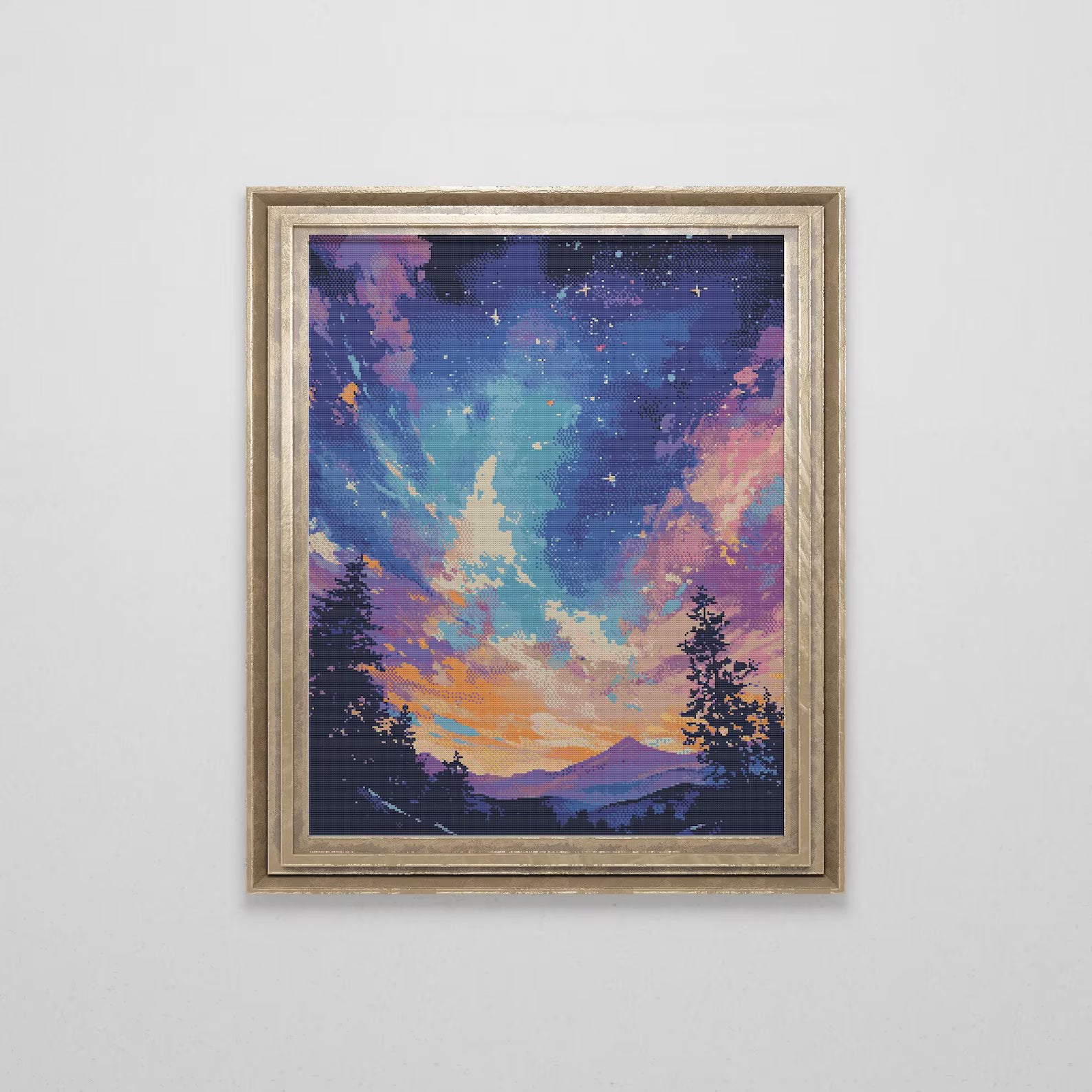 Night Sky over Trees Cross Stitch Pattern | Landscape Large Counted Cross Stitch Chart Download | Fantasy Cross Stitch Patterns