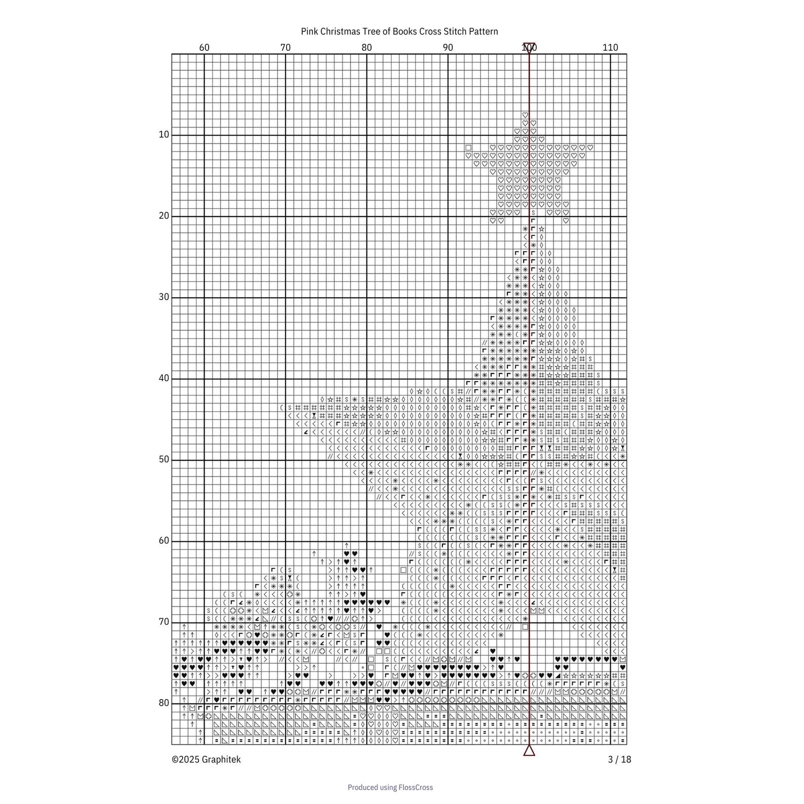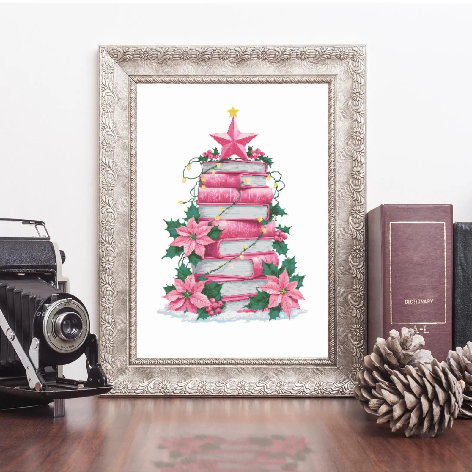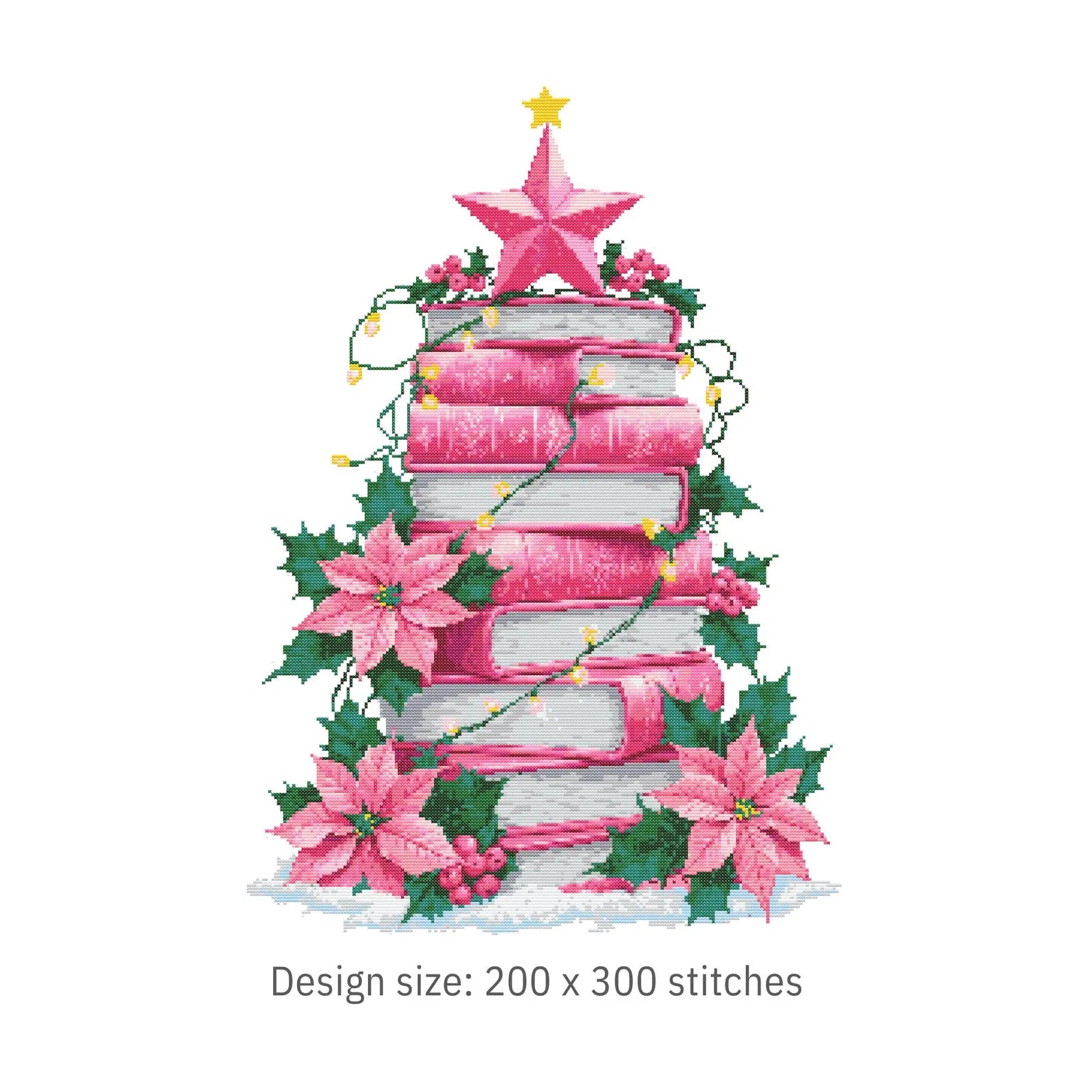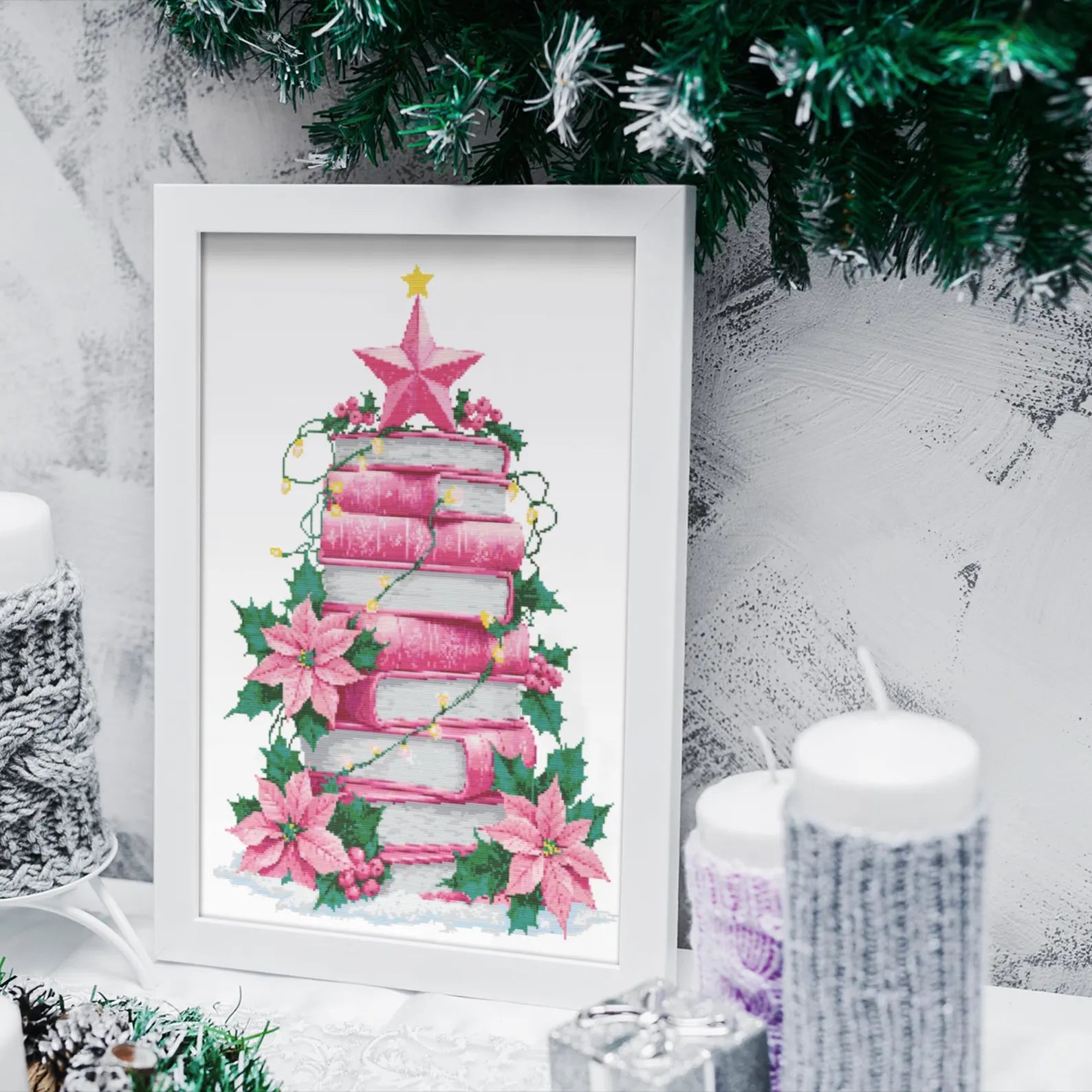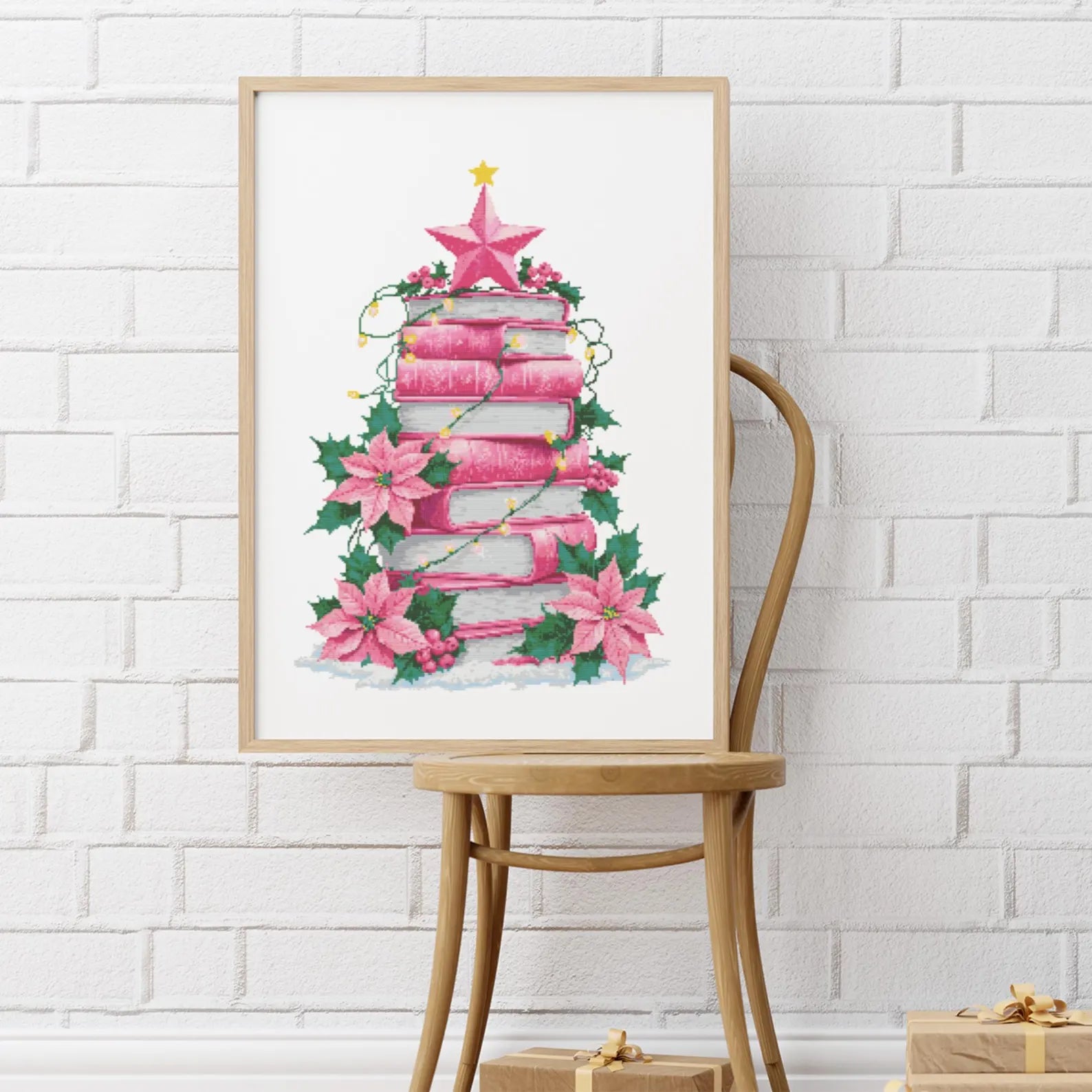 Pink Christmas Tree of Books Cross Stitch Pattern