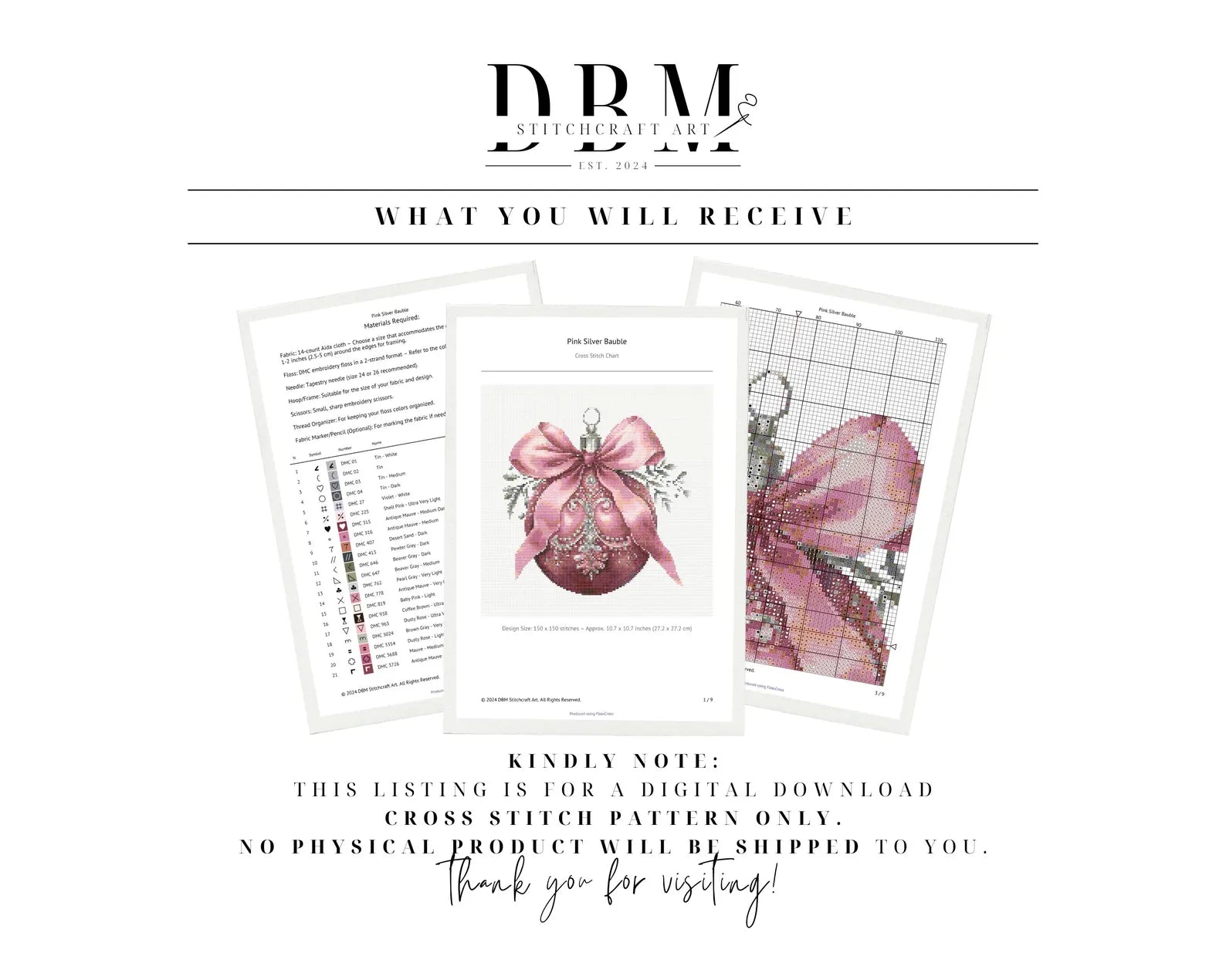 Discover my Pink Silver Bauble Cross Stitch Pattern, designed for intermediate stitchers. This PDF guide includes all the details needed to create an ornate pink Christmas ornament adorned with silver accents, a soft pink bow, and framed by silver-toned leaves. Perfect for adding a touch of feminine elegance to your holiday cross-stitch projects.