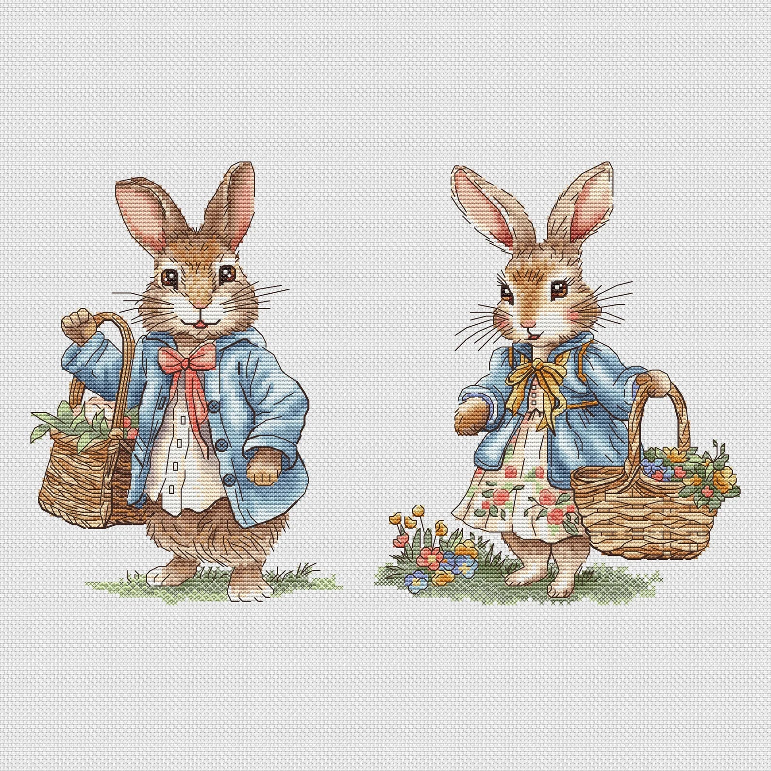 Rabbit lady and Rabbit gentleman Cross Stitch Pattern, with a basket of flowers Instant Download Spring Summer Decor PDF Digital File