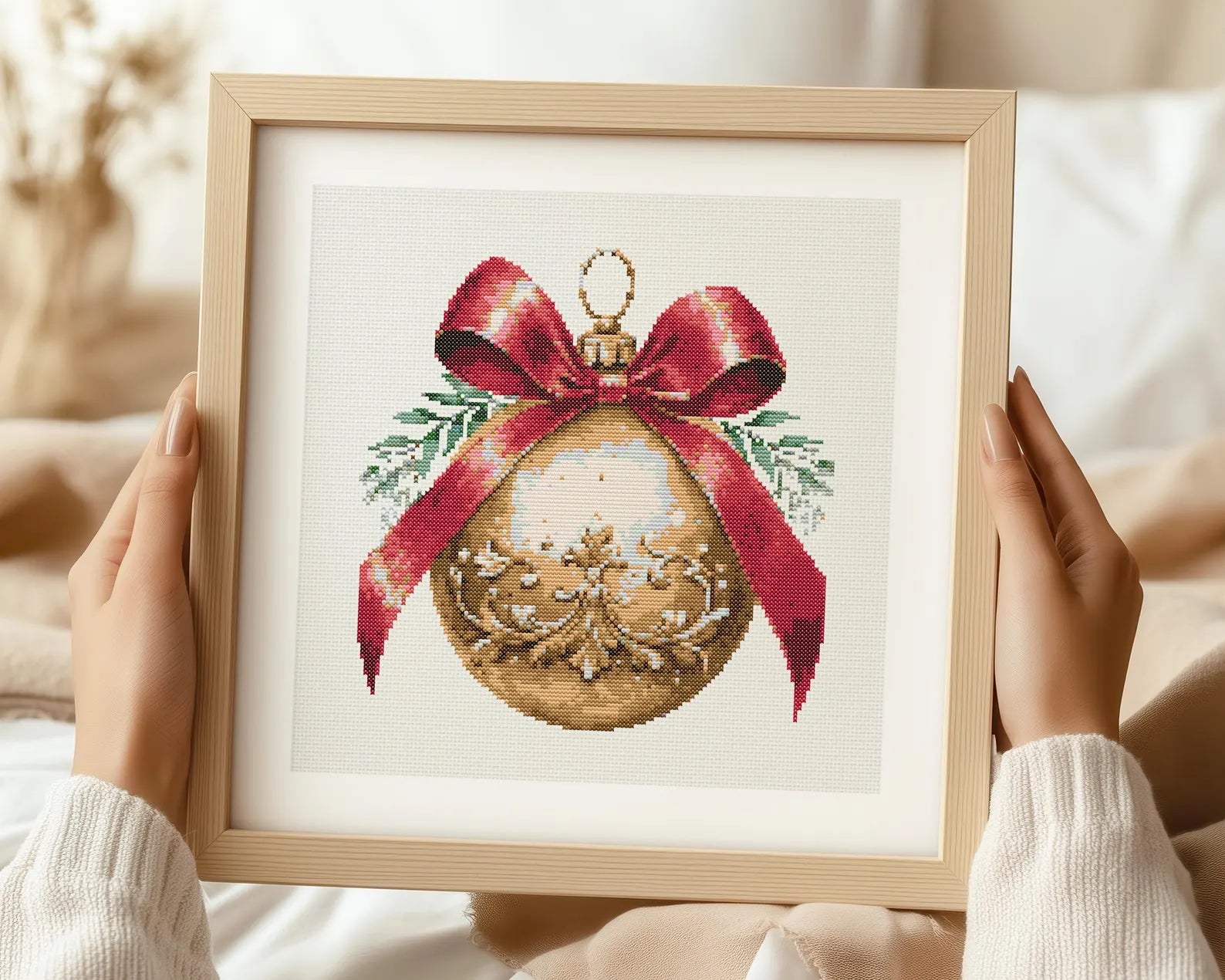 Discover my Red Gold Bauble Cross Stitch Pattern, designed for intermediate stitchers. This PDF guide includes all the details needed to create an ornate gold Christmas ornament adorned with a traditional red bow and framed by green leaves. Perfect for adding a touch of classic festive elegance to your holiday cross-stitch projects.