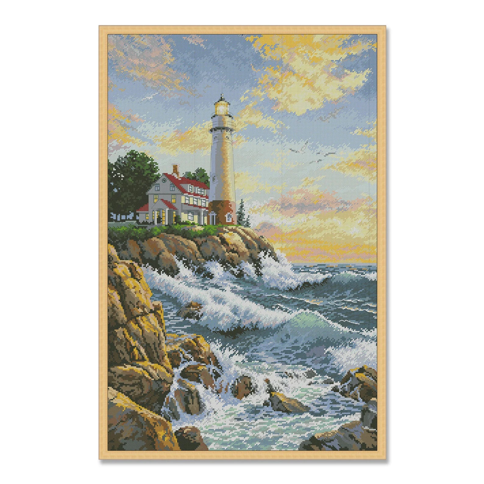 Rocky Point, Lighthouse, Counted Cross Stitch Pattern, Summer Landscape, Needlepoint Chart, Digital Pattern PDF, Seagulls, Boat, Sea Wave