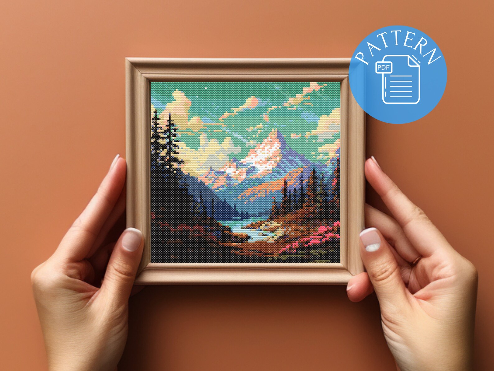 Embark on a stitching journey with our scenic mountain lake cross stitch pattern, where every stitch brings you closer to the tranquil beauty of nature. This picturesque design, sized at 112 x 112 stitches, perfectly captures the serene essence of a sunset-drenched landscape, framed by majestic mountains and flourishing flora. Ideal for both novice and seasoned stitchers, this digital pattern includes a comprehensive PDF guide detailing 30 specific DMC colors to bring this awe-inspiring scenery to life.
