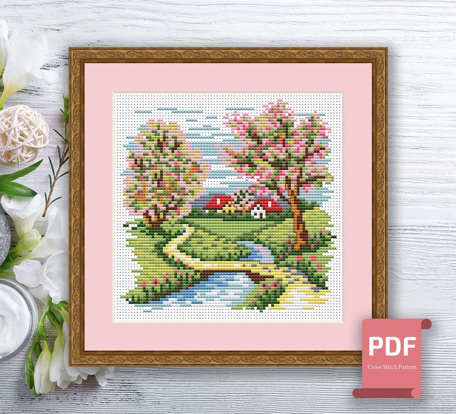 1. Spring Landscape Cross Stitch Pattern #ssn046