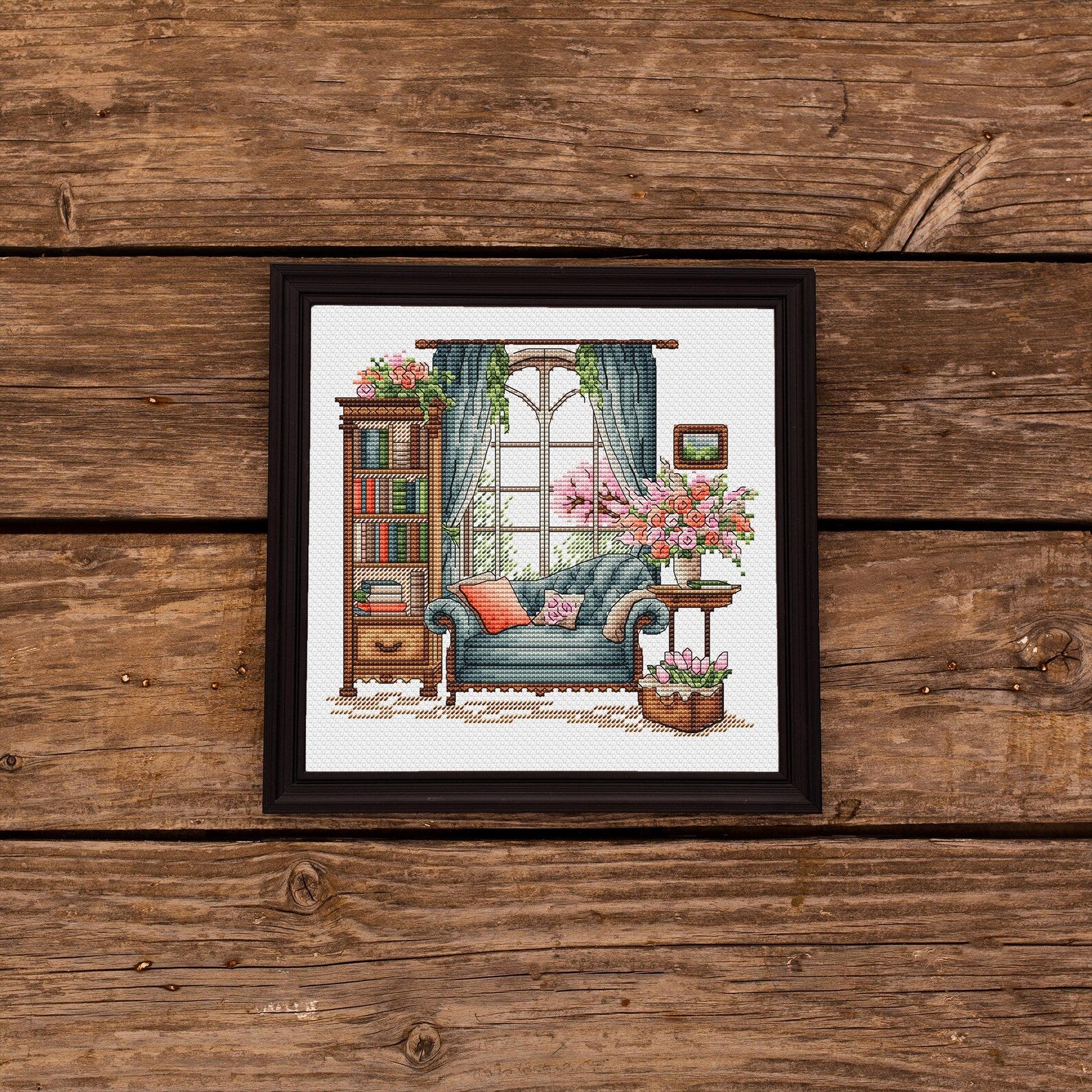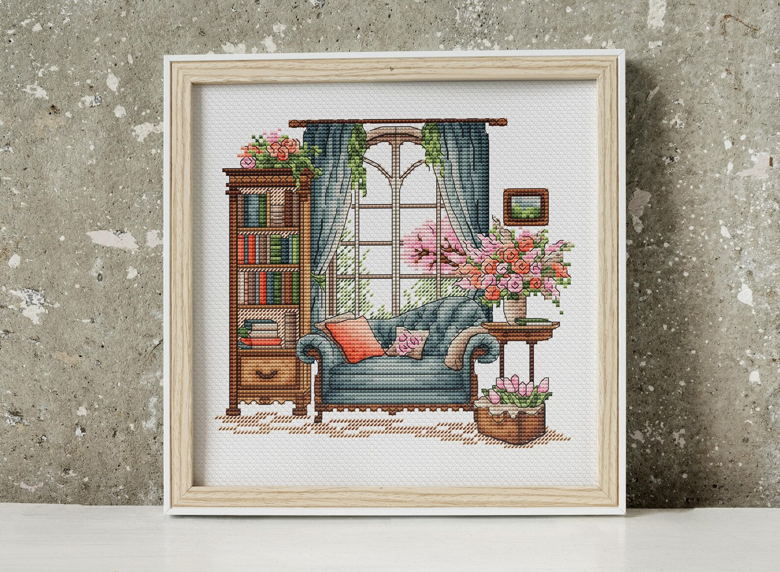 This cross-stitch embroidery is like a window into a world of coziness. The blue sofa awaits an evening of rest, the scent of flowers fills the room, and the spring breeze plays with the curtains. On the shelf lie stories waiting to come alive. Every stitch holds warmth and peace, as if the embroidery preserves these cozy moments.