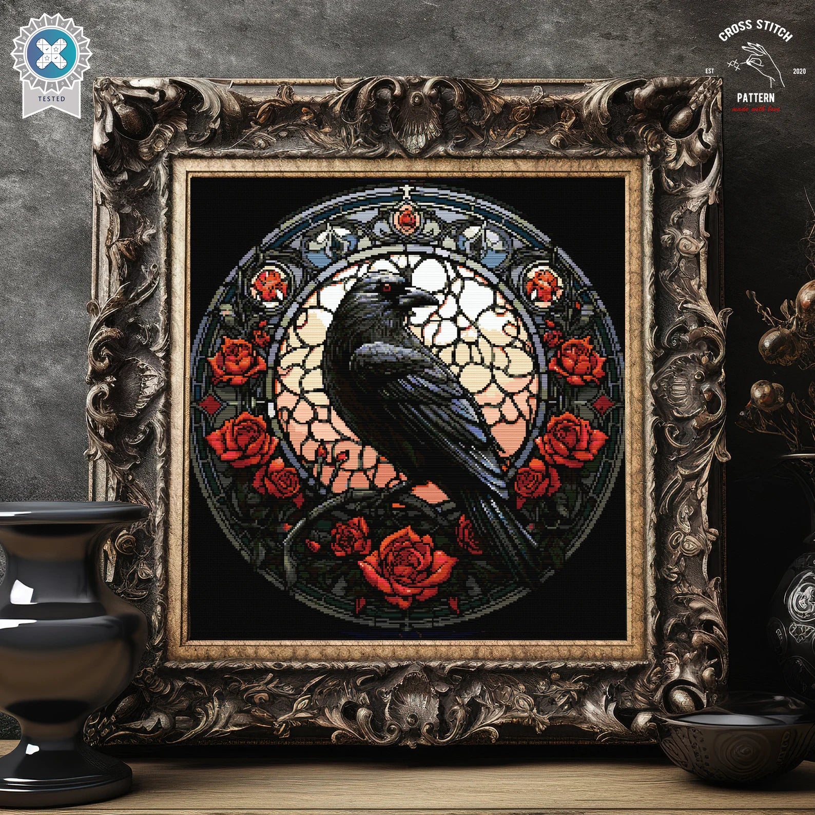 Stained Glass Raven Cross Stitch Pattern Gothic Crow cross stitch Spooky Halloween embroidery Horror cross stitch Mystic Witchy stitcher
