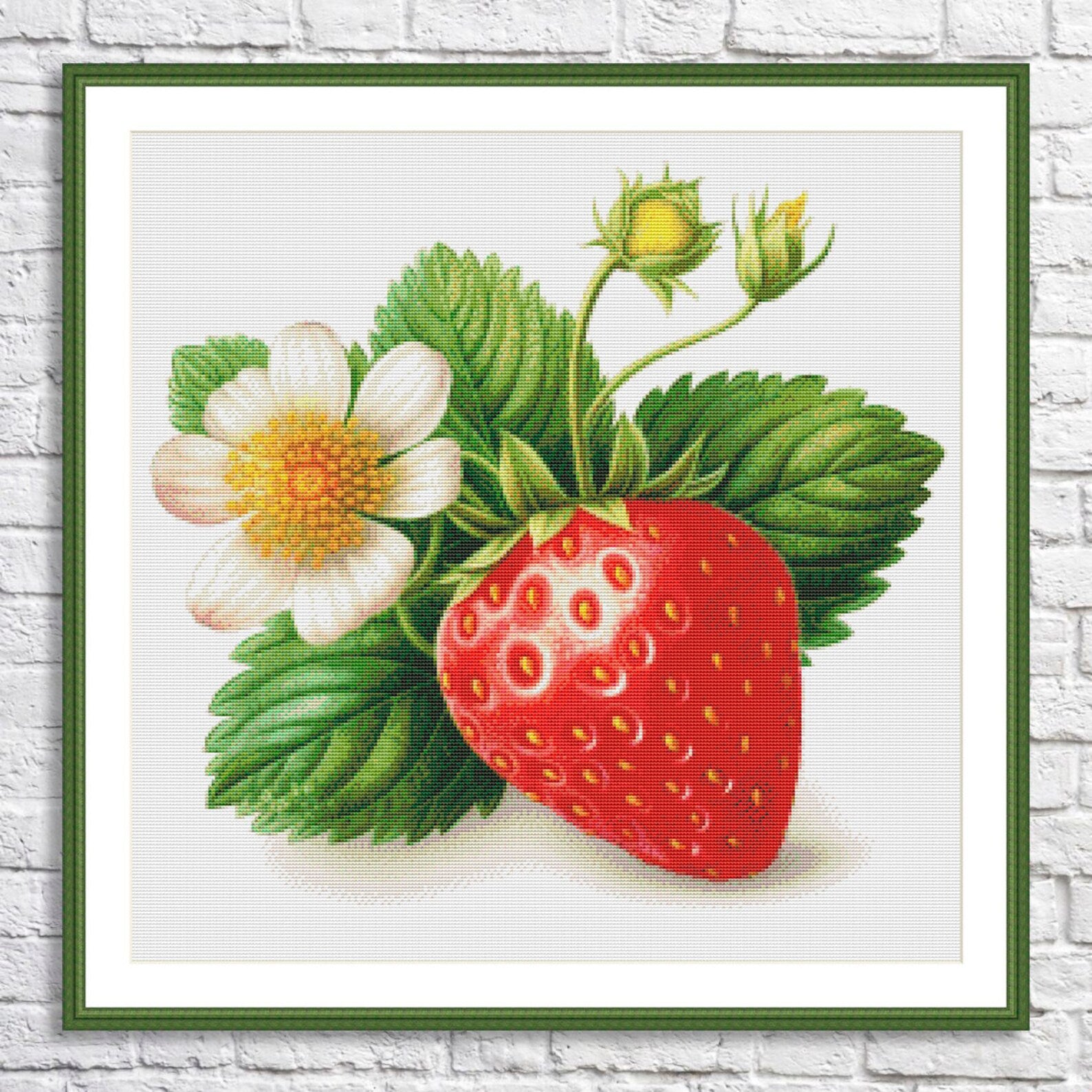Strawberry Cross Stitch Pattern Kitchen Still Life Modern Decor Pattern Needlepoint chart Summer Berries White Flower Branch Green Leaves