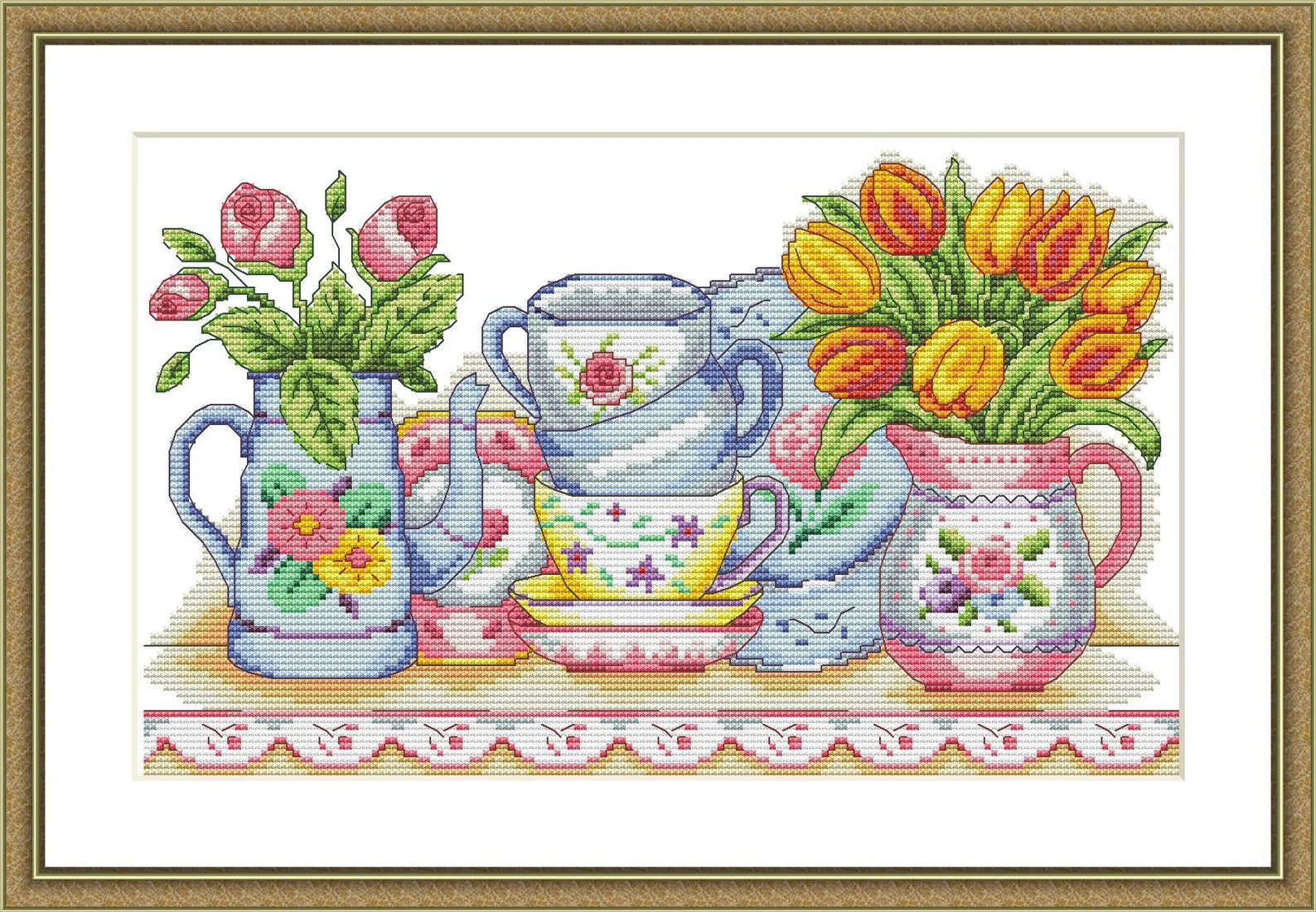 Tea service Cross Stitch Pattern Bouquet of spring flowers Kitchen Still Life Modern Decor Pattern Cups Napkins Embroidery Needlepoint chart