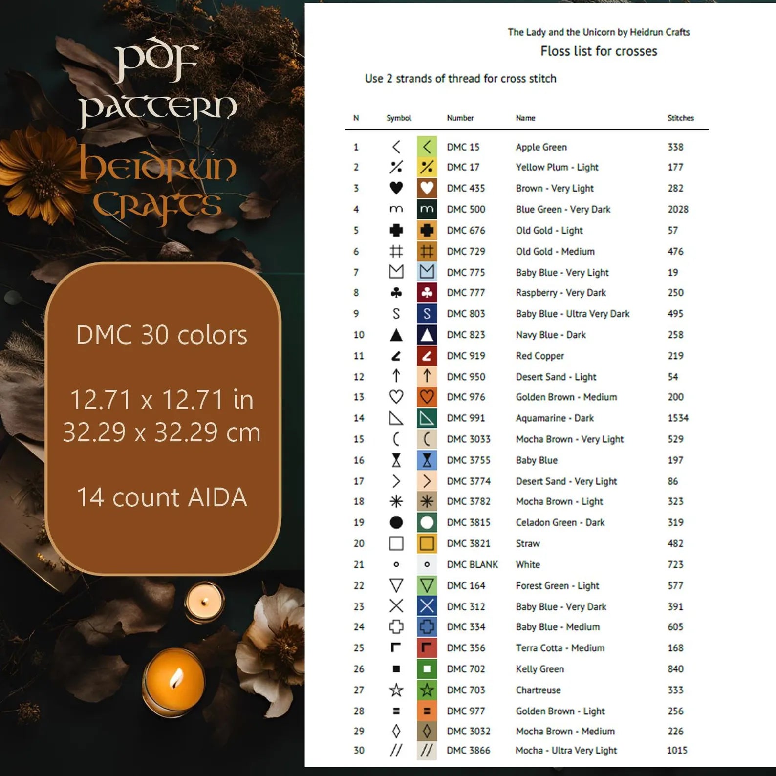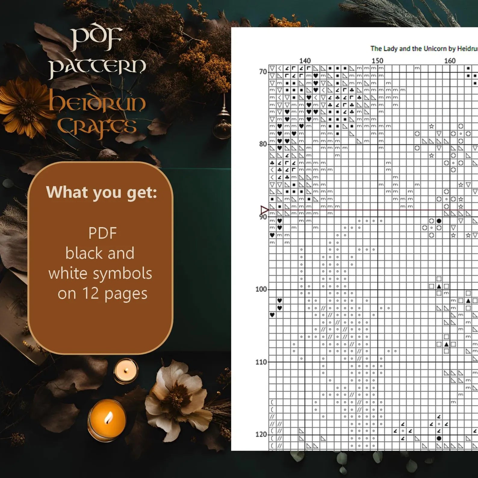 Inspired by the iconic medieval tapestry series, this cross stitch pattern of the Lady and the Unicorn brings timeless beauty and fantasy into your embroidery. Featuring an elegant lady alongside a unicorn, framed by intricate flora and symbolic elements, the design captures the essence of medieval art and storytelling.