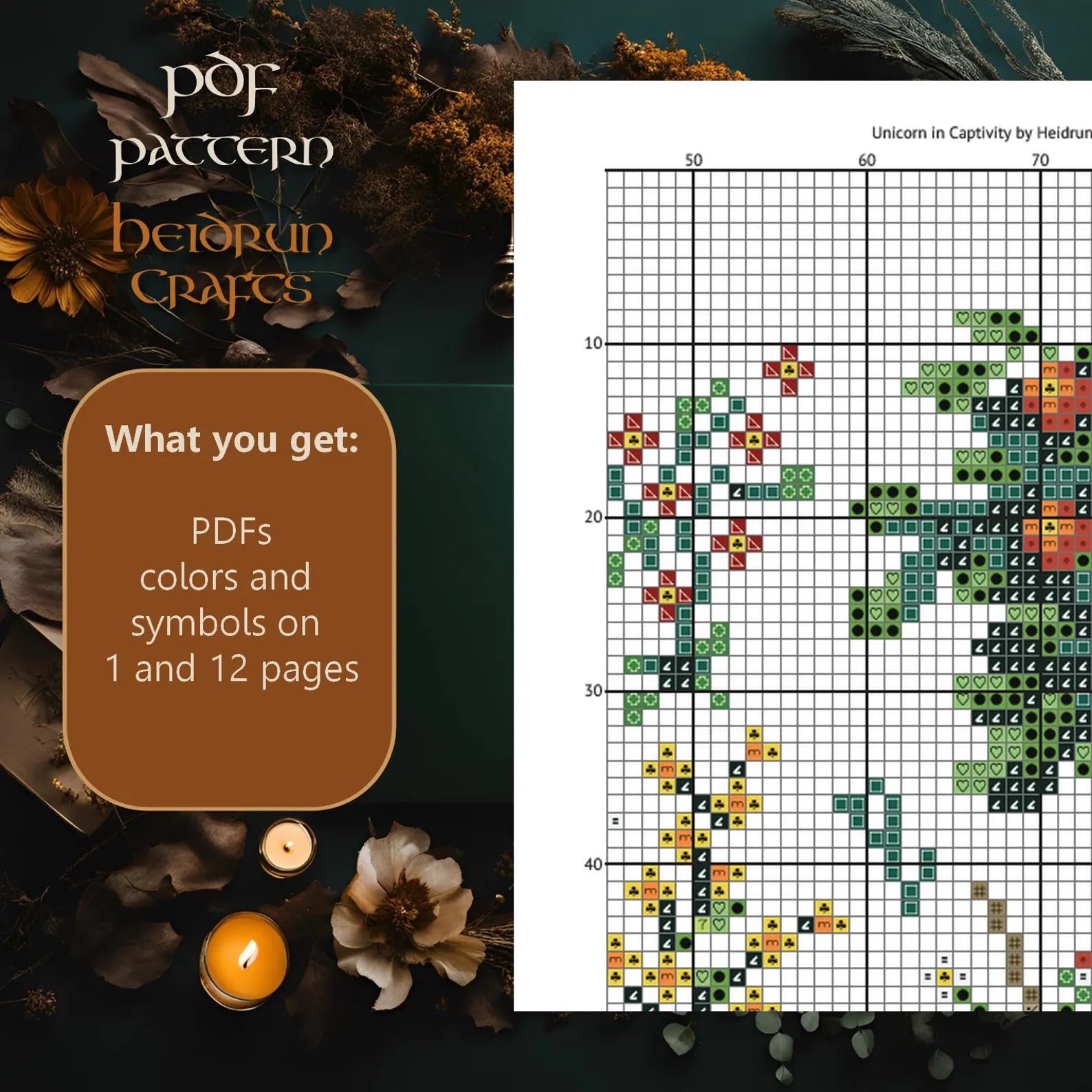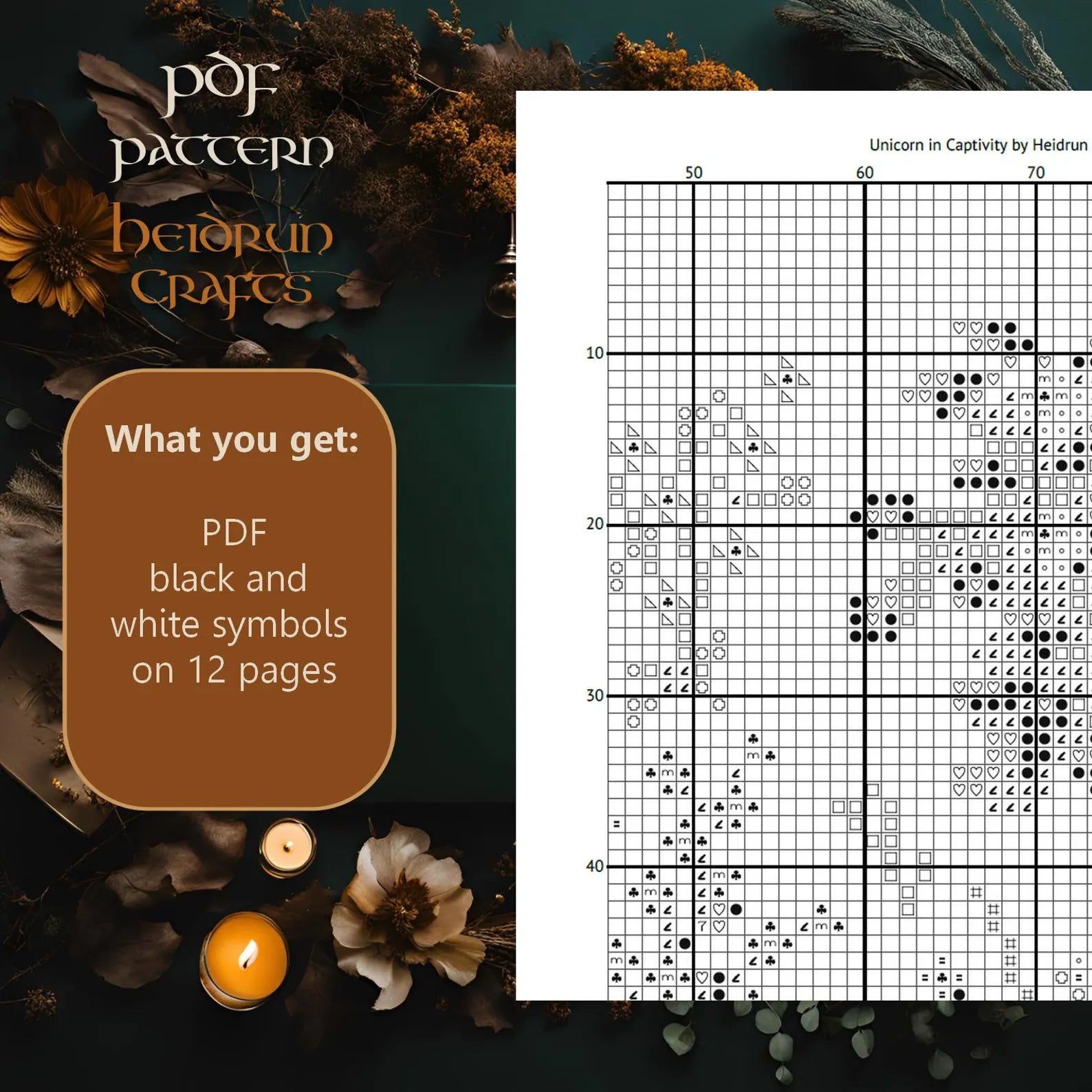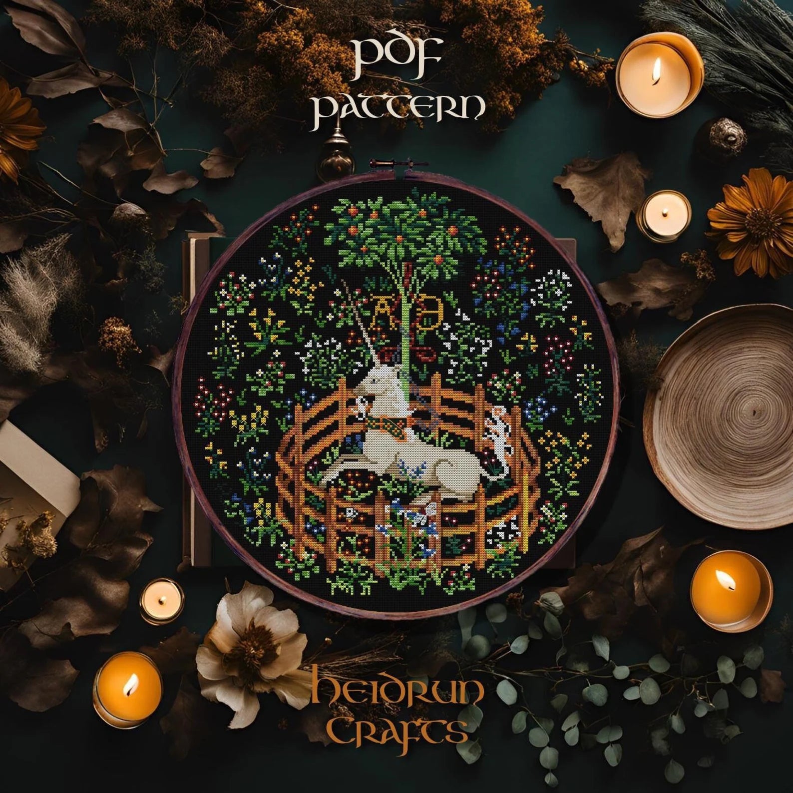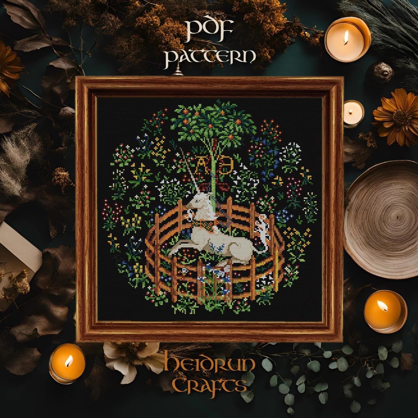Step into the world of medieval fantasy with this Unicorn in Captivity Cross Stitch Pattern! Inspired by the famous 15th-century tapestry, this pattern captures the majestic unicorn resting within an enclosed garden, surrounded by lush foliage and rich medieval motifs.